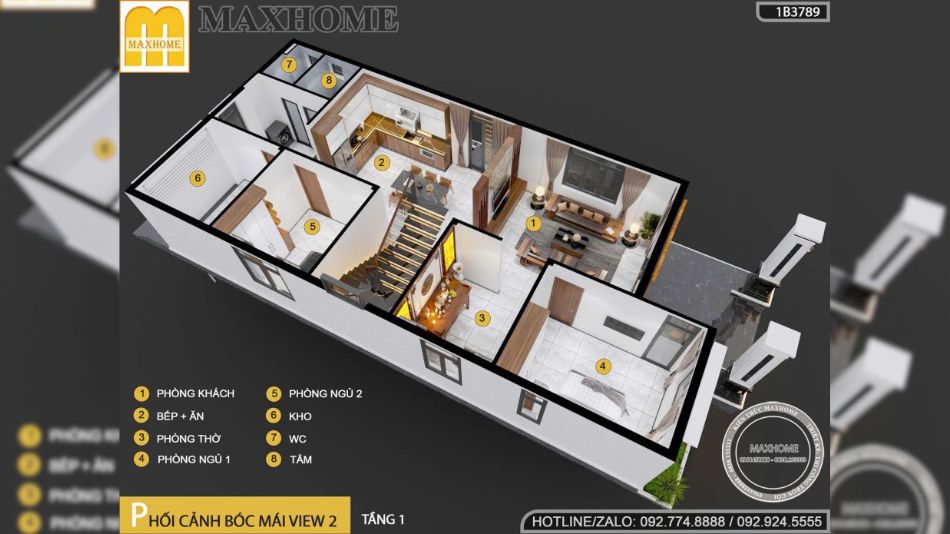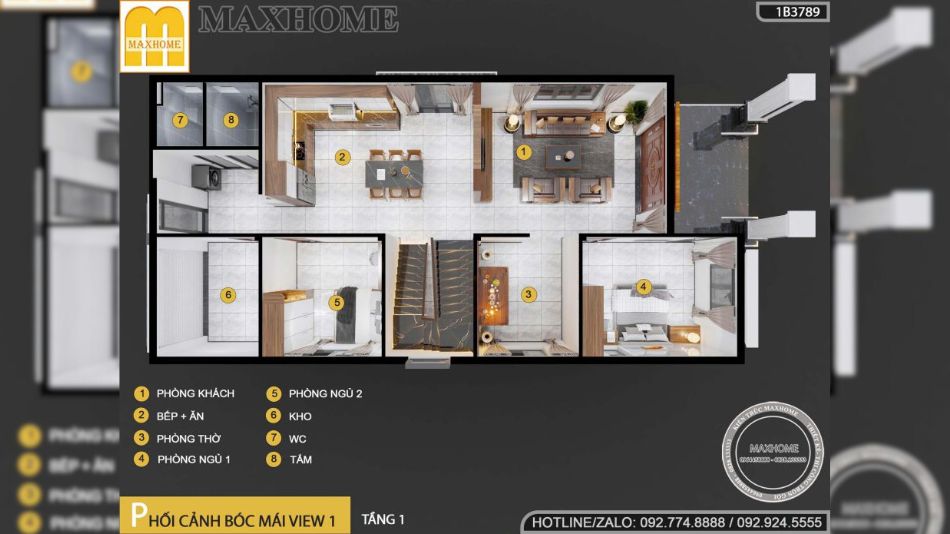 Từ sảnh chính bước vào là không gian phòng khách rộng rãi, sang trọng, được bố trí khoa học tạo cảm giác thông thoáng và dễ chịu. Kế tiếp là khu vực phòng thờ được thiết kế riêng biệt, trang nghiêm, phù hợp với phong tục thờ cúng của người Việt. Phòng bếp và khu vực ăn uống được bố trí hợp lý, có lối đi phụ ra bên hông nhà, giúp việc di chuyển và thoát mùi nấu nướng thuận tiện hơn. Ngoài ra, ngôi nhà còn có 2 phòng ngủ riêng tư, cùng phòng kho tiện dụng và khu vực nhà vệ sinh, phòng tắm đặt cuối nhà, đảm bảo sự gọn gàng, kín đáo và tiện nghi trong sinh hoạt hằng ngày.