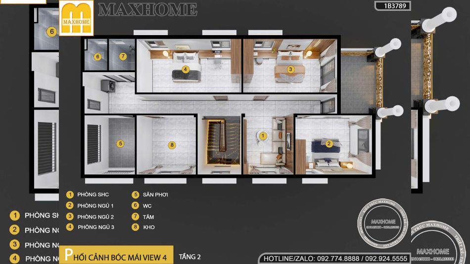 Tầng 2 được bố trí khoa học và tiện nghi, gồm phòng sinh hoạt chung rộng rãi – nơi các thành viên trong gia đình có thể thư giãn, trò chuyện và gắn kết sau những giờ làm việc, học tập. Ba phòng ngủ được sắp xếp hợp lý, đảm bảo sự riêng tư và thoải mái cho từng thành viên. Ngoài ra, tầng này còn có phòng kho nhỏ tiện lợi, khu vực sân phơi thoáng đãng giúp quần áo nhanh khô và đón nắng tự nhiên. Nhà vệ sinh và phòng tắm chung đặt ở cuối hành lang, vừa tối ưu diện tích, vừa đảm bảo tính kín đáo và thuận tiện trong quá trình sử dụng.