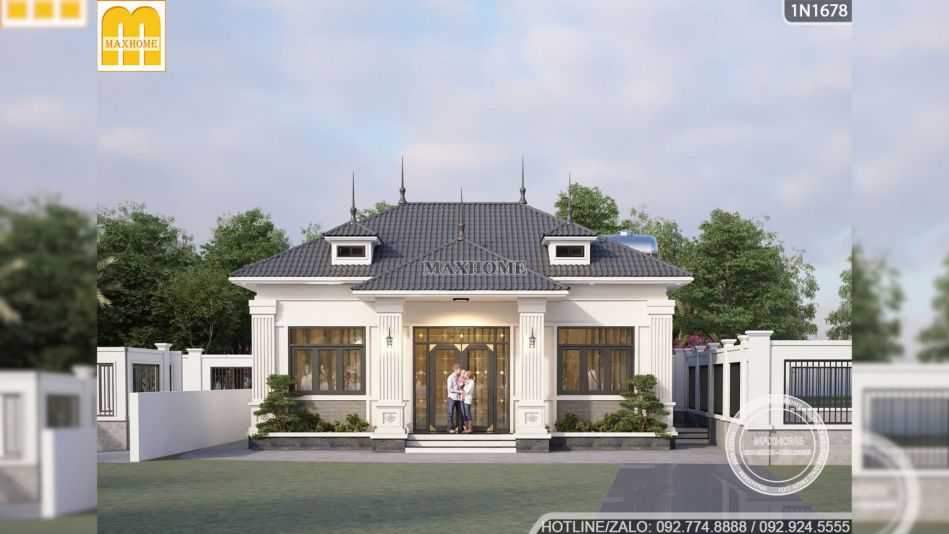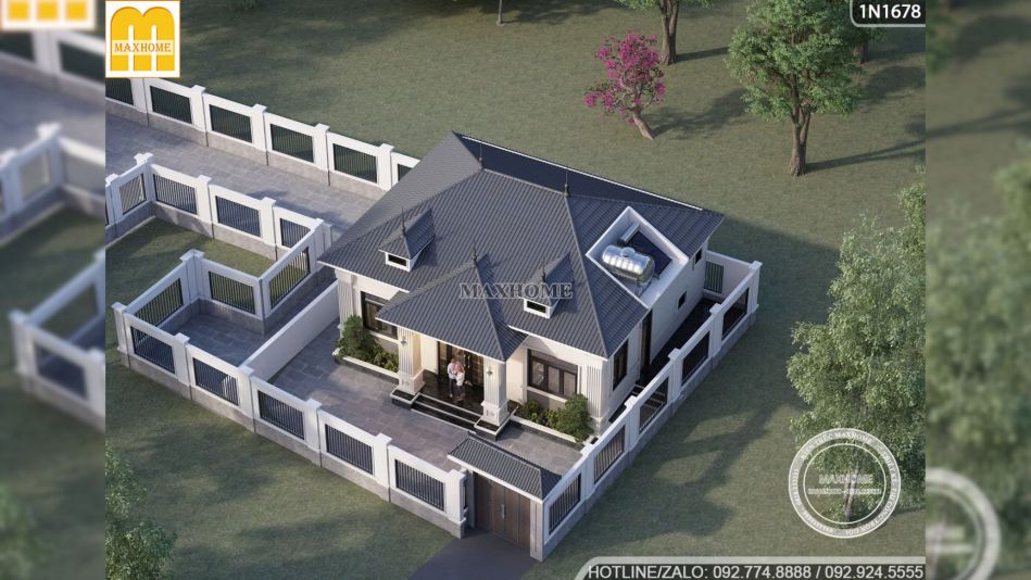 Việc lựa chọn ngói và vì kèo siêu nhẹ Maxhome không chỉ giảm tải trọng cho công trình mà còn mang đến sự an tâm tuyệt đối nhờ chế độ bảo hành trên 20 năm. Khi nhìn từ trên cao, phần mái đăng đối cùng các chi tiết chóp đỉnh nhấn nhá khiến ngôi nhà như được đội vương miện, toát lên vẻ kiêu sa nhưng không khoa trương.