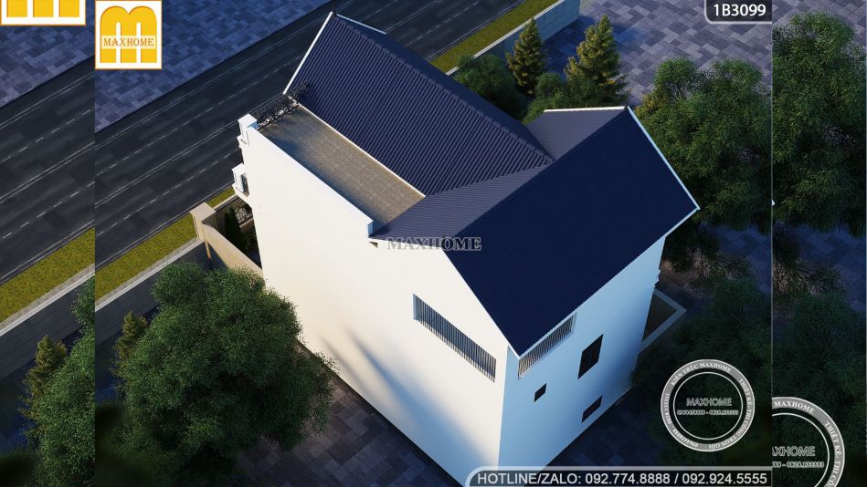 Phần mái Thái cao 2,55m sở hữu độ dốc lớn không chỉ giúp thoát nước nhanh mà còn tạo nên vẻ thanh thoát, cao ráo cho tổng thể công trình. Gam màu xanh than của mái tương phản nhẹ với nền sơn trắng mang lại sự hài hòa và sang trọng. Dưới mỗi góc nhìn của biệt thự 3 tầng mái Thái đều toát lên vẻ uy nghi, thể hiện sự bề thế và quyền quý.