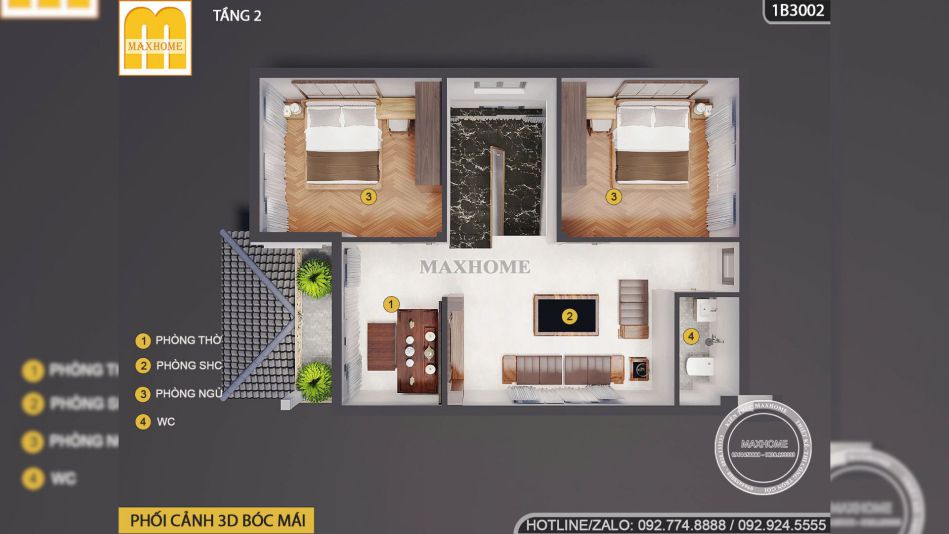 • Tầng 2: Phòng thờ, phòng sinh hoạt chung, 2 phòng ngủ, 1 wc