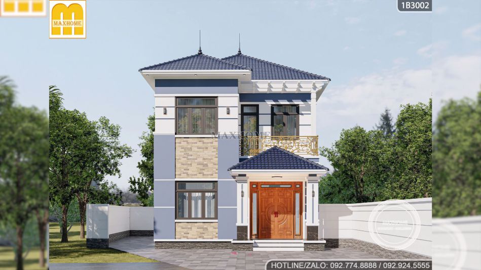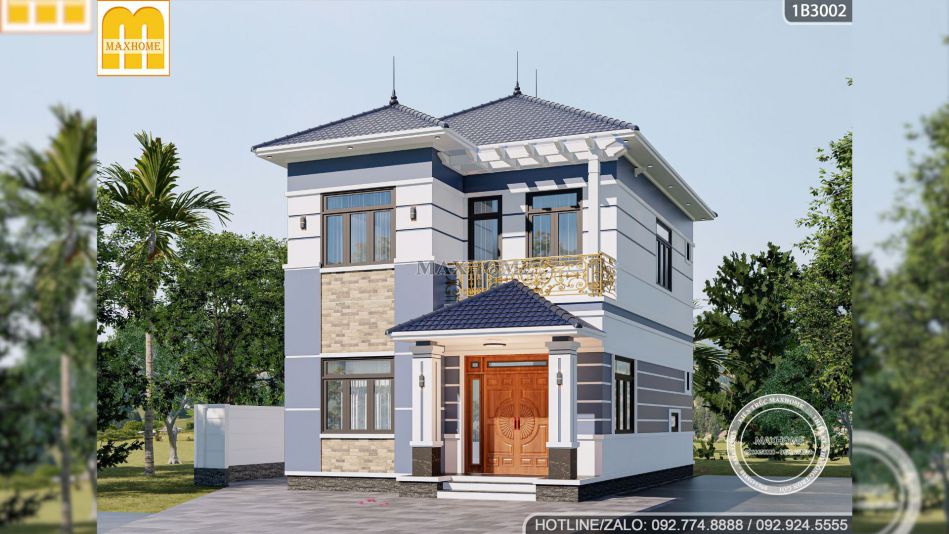 Tổng thể mẫu nhà 2 tầng hiện đại của anh Hùng được xây dựng với kích thước 7,7×12,1m vừa đủ để tạo nên một ngôi nhà bề thế, cân đối và phù hợp với nhu cầu sinh hoạt của gia đình 4 đến 6 thành viên. Ngay từ cái nhìn đầu tiên, mẫu nhà đẹp này đã gây ấn tượng mạnh bởi hình khối kiến trúc rõ ràng, vững chãi nhưng vẫn giữ được nét mềm mại nhờ sự kết hợp khéo léo giữa màu sắc, vật liệu và chi tiết trang trí tinh tế.