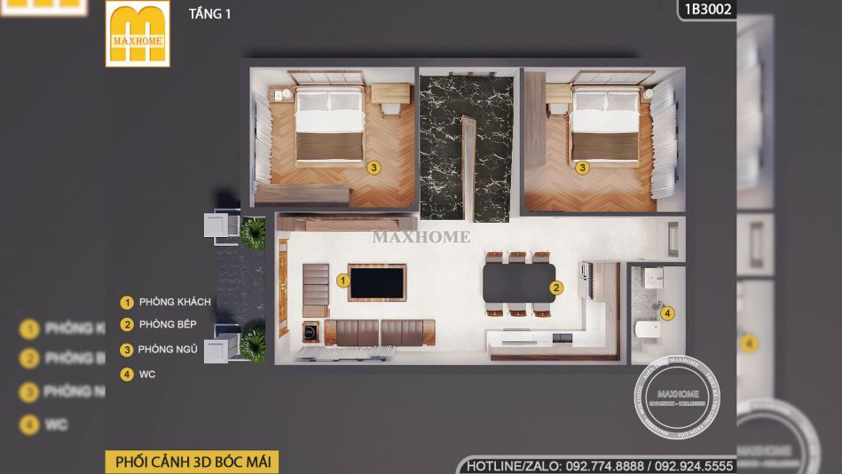 • Tầng 1: Phòng khách, phòng bếp, 2 phòng ngủ, 1 wc