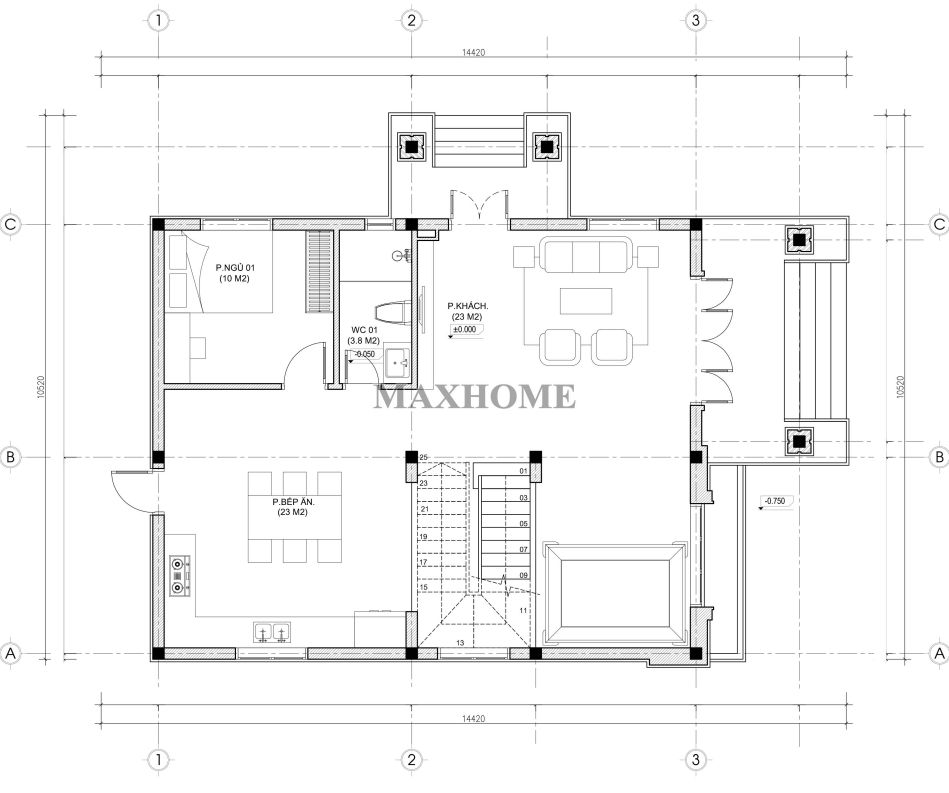 Tiến về phía sau là phòng bếp ăn được thiết kế rộng rãi, thuận tiện cho sinh hoạt gia đình. Đối diện khu vực bếp là phòng ngủ, đảm bảo sự riêng tư mà vẫn dễ dàng di chuyển. Kế bên đó là nhà vệ sinh chung, được bố trí hợp lý để phục vụ nhu cầu sử dụng cho toàn bộ tầng.