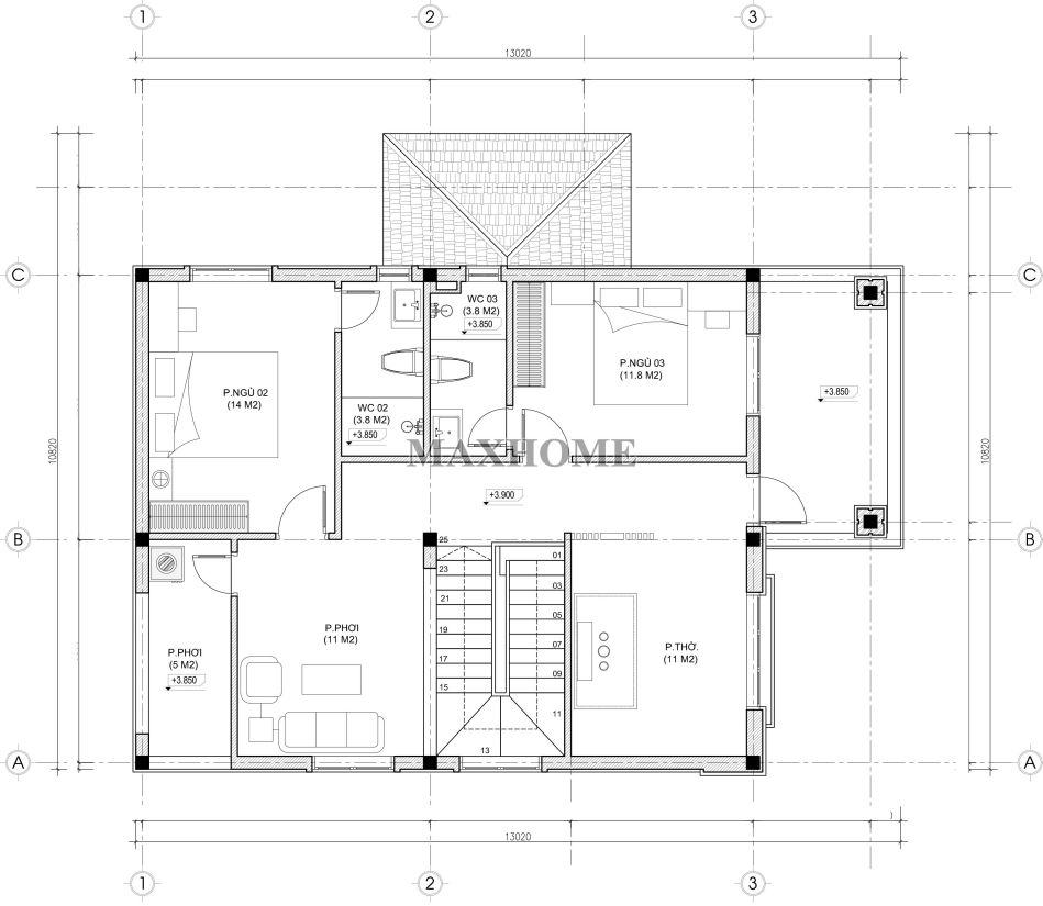 • Tầng 2: Phòng thờ, phòng sinh hoạt chung, 2 phòng ngủ, 2 wc