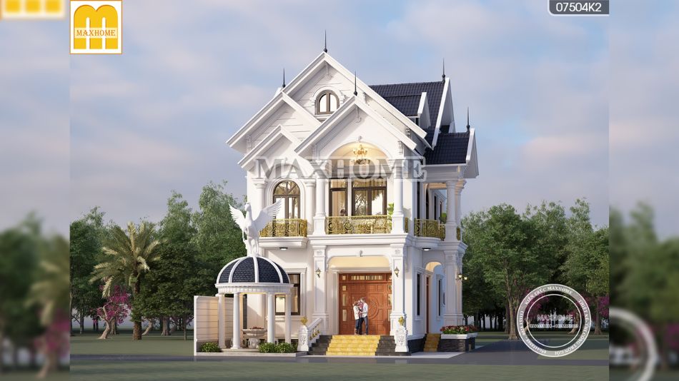 Mẫu nhà 2 tầng mái Thái 150m², 4 phòng ngủ phong cách tân cổ điển nổi bật với những đường phào chỉ tinh xảo, bố cục đăng đối và mặt tiền sang trọng. Sự kết hợp giữa mái Thái thanh thoát và chi tiết kiến trúc cổ điển tạo nên một không gian sống đẳng cấp, trang nhã nhưng vẫn đầy ấm cúng.