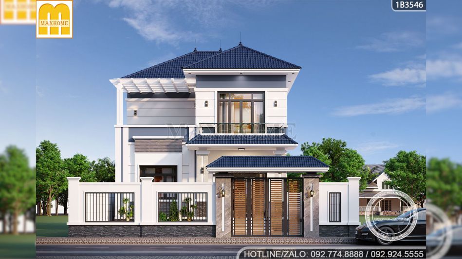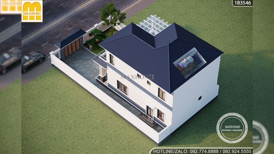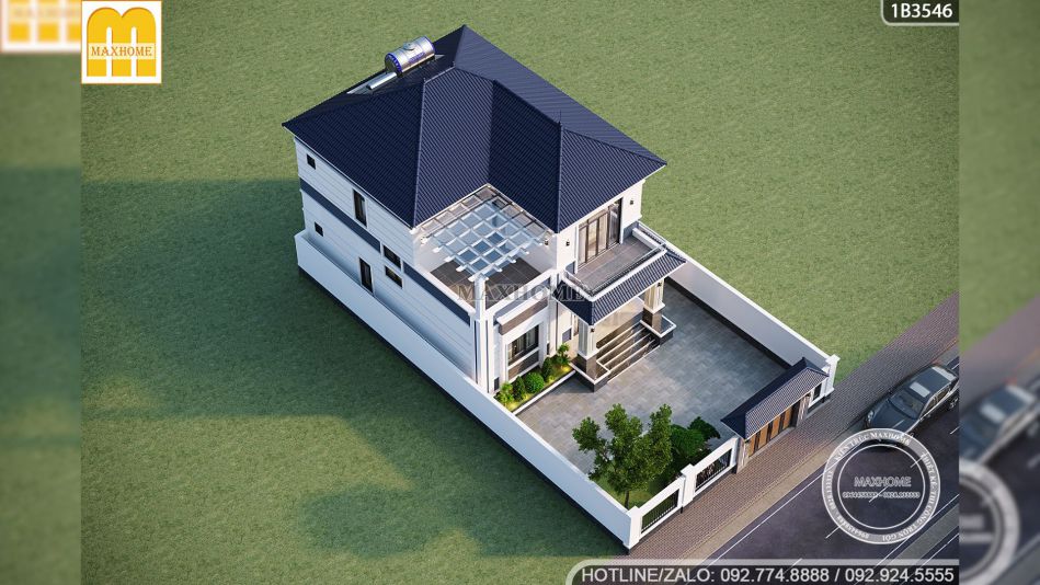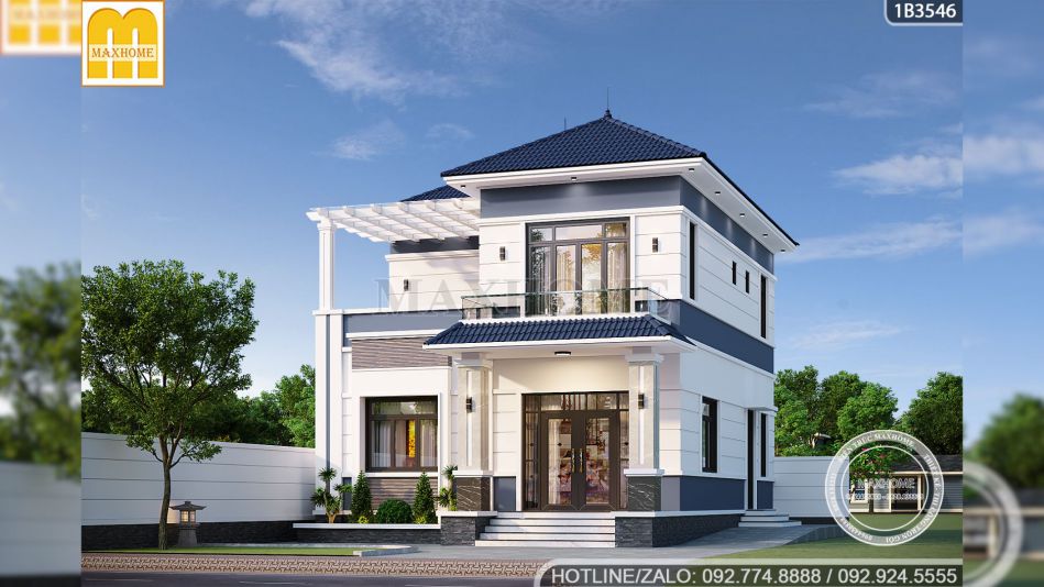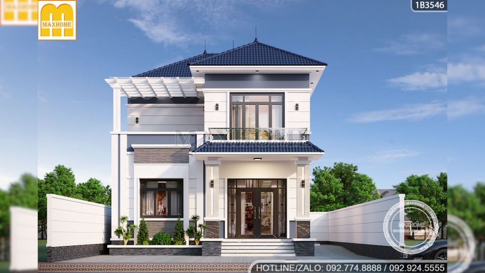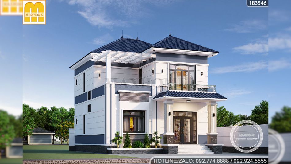 Đi sâu vào chi tiết kiến trúc, chúng ta sẽ thấy sự tinh tế trong việc xử lý hình khối mà đội ngũ thiết kế Maxhome đã dành cho chị Giang. Ngôi nhà sở hữu mặt tiền rộng rãi lên tới 11,2m, một con số lý tưởng để phô diễn những đường nét kiến trúc tinh xảo. Nhìn vào bản vẽ mẫu nhà đẹp có thể thấy chiều cao thông thủy của tầng 1 được thiết kế đạt 3,9m thông thoáng, rất phù hợp cho không gian phòng khách. Tầng 2 với chiều cao 3,6m giúp tổng thể công trình đạt độ cao gần 11m tính từ cốt sân lên đến đỉnh mái, tạo nên thế đứng sừng sững, bề thế