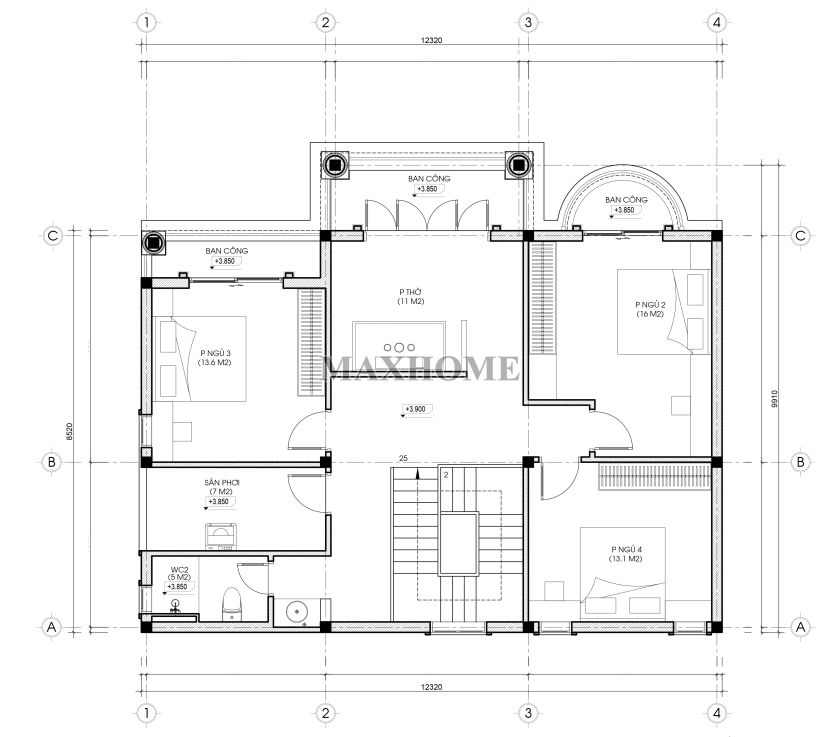 Tầng 2: Phòng thờ, 3 phòng ngủ, 1 wc, sân phơi