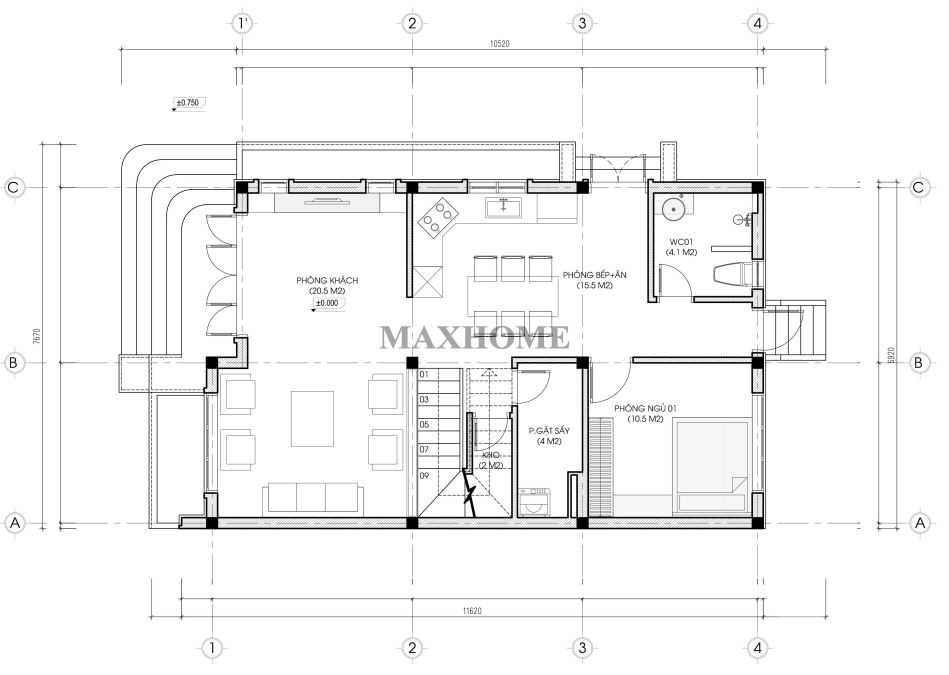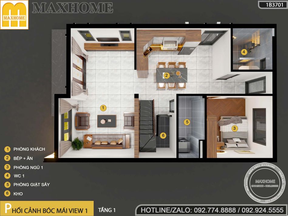 Từ cửa chính bước vào là không gian phòng khách rộng 20,5m², được bố trí hợp lý với bộ sofa lớn tạo cảm giác sang trọng và thoải mái khi đón tiếp khách. Khu vực bếp và phòng ăn được thiết kế liền kề, thuận tiện cho sinh hoạt hàng ngày và đảm bảo sự kết nối giữa các thành viên trong gia đình. Cuối nhà là một phòng ngủ yên tĩnh, thích hợp cho người lớn tuổi hoặc làm phòng nghỉ cho khách. Ngoài ra, khu vực chân cầu thang được tận dụng thông minh để làm phòng kho và khu giặt sấy, giúp tối ưu không gian và tăng tính tiện nghi cho ngôi nhà. Nhà vệ sinh chung được bố trí khoa học, dễ dàng tiếp cận từ mọi khu vực, đảm bảo sự tiện lợi và riêng tư trong quá trình sử dụng.