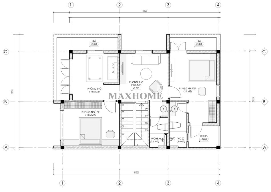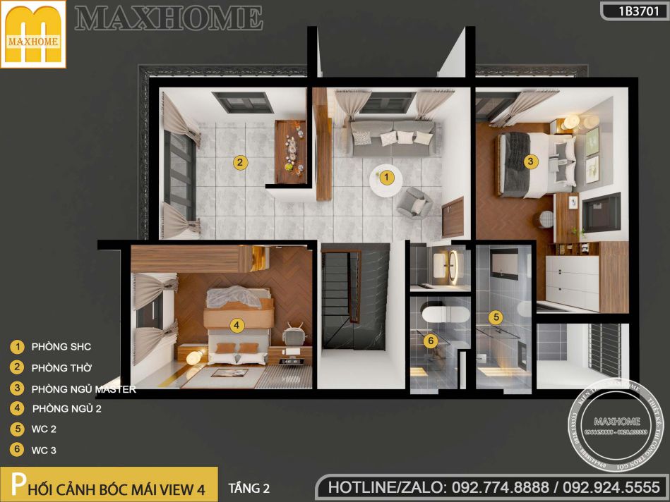 Tầng 2 được bố trí phòng thờ trang nghiêm, hướng đặt bàn thờ được tính toán hợp phong thủy, thể hiện lòng hiếu kính của gia chủ đối với tổ tiên. Liền kề phòng thờ là phòng sinh hoạt chung, nơi các thành viên quây quần, trò chuyện và thư giãn sau những giờ làm việc căng thẳng. Không gian tầng 2 còn bao gồm hai phòng ngủ, trong đó có một phòng ngủ thường dành cho con cái hoặc khách đến chơi, và một phòng ngủ master rộng rãi được tích hợp nhà vệ sinh khép kín cùng logia riêng, mang đến sự riêng tư, tiện nghi và thoáng mát cho người sử dụng. Tổng thể tầng 2 được thiết kế khoa học, đảm bảo sự cân đối giữa tính thẩm mỹ và công năng sử dụng.