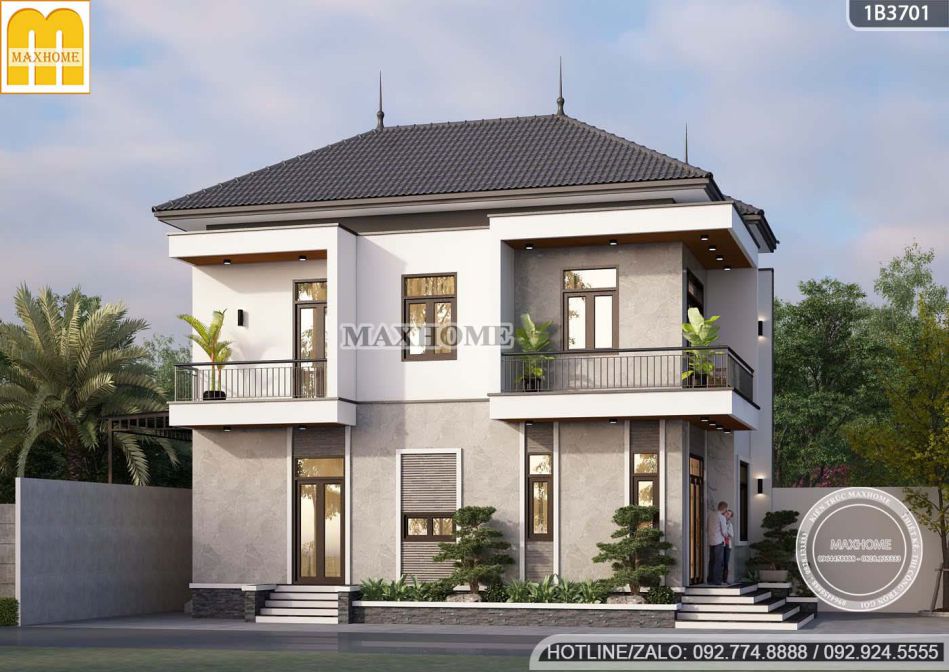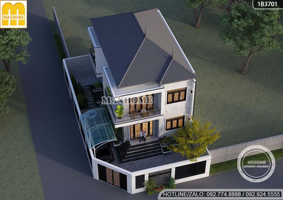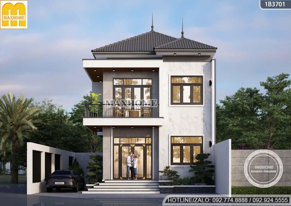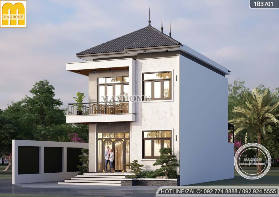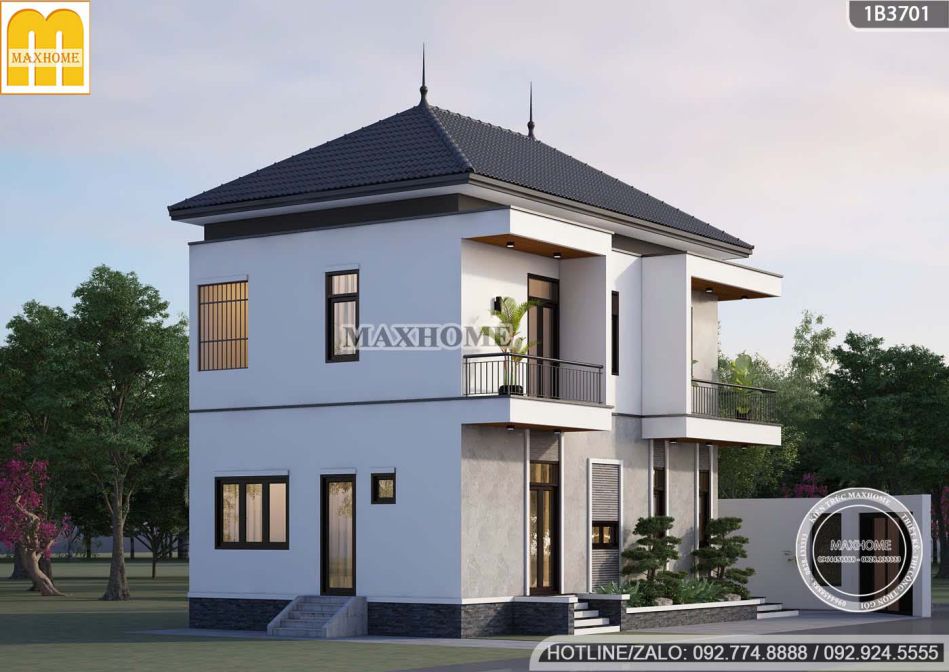 Maxhome xin giới thiệu đến quý khách hàng mẫu bản vẽ nhà 2 tầng mái Nhật được xây dựng trên lô đất góc đắc địa với hai mặt tiền thoáng đãng, mang lại lợi thế lớn về ánh sáng, gió tự nhiên và giá trị thẩm mỹ cao. Nhờ vị trí đặc biệt này, công trình không chỉ phô diễn trọn vẹn vẻ đẹp kiến trúc tinh tế mà còn trở thành tâm điểm nổi bật giữa khu phố. Ngôi nhà được khoác lên mình gam màu trắng trang nhã làm chủ đạo, kết hợp cùng những mảng tường phun đá nghệ thuật ở mặt tiền, tạo nên tổng thể hiện đại, sang trọng và cuốn hút từ mọi góc nhìn.