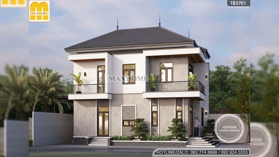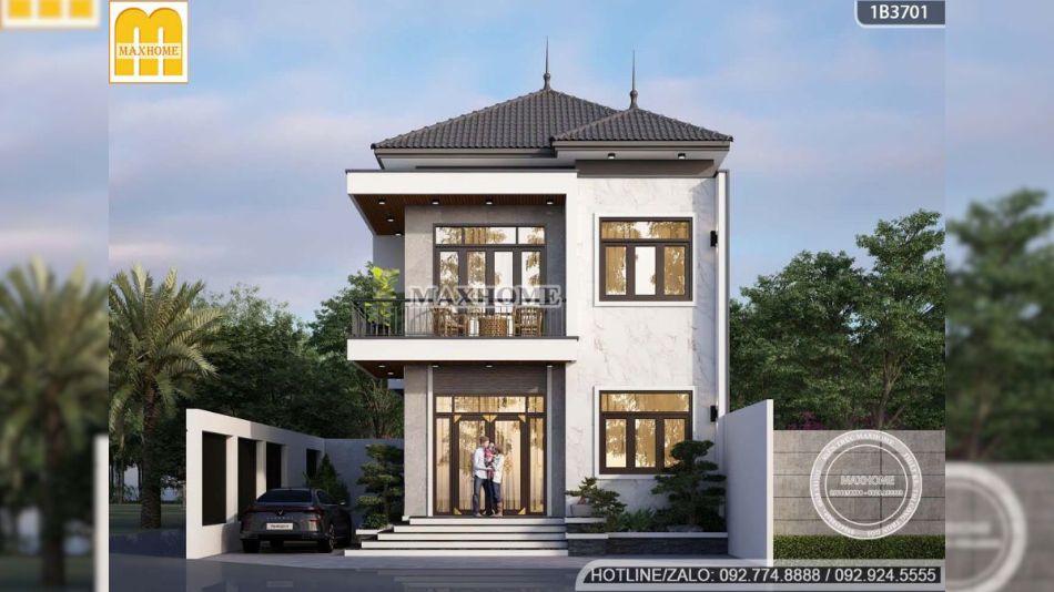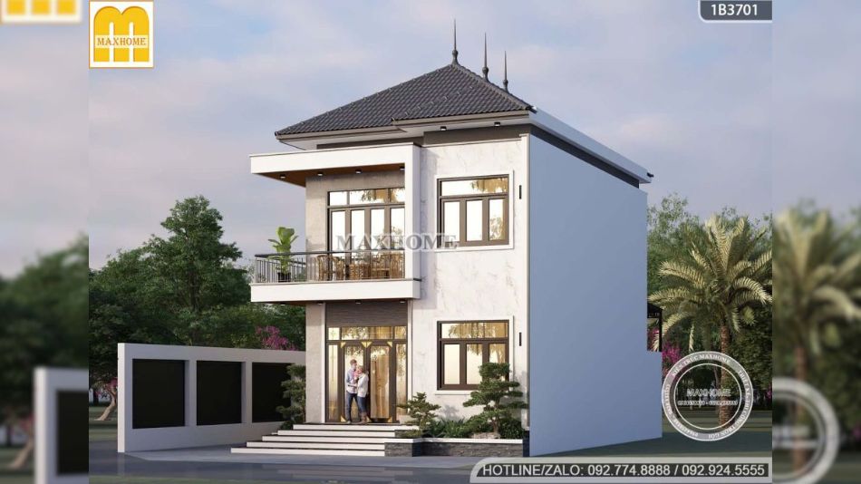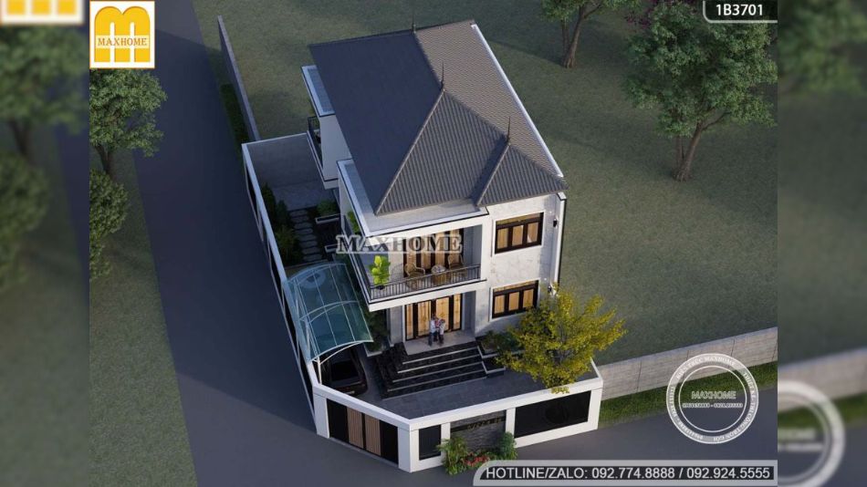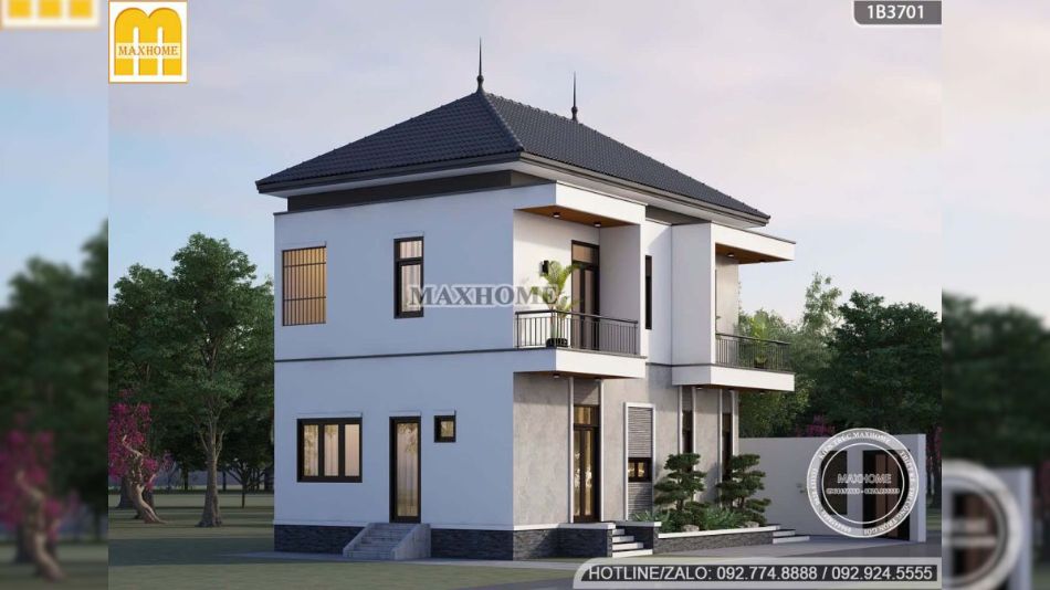Maxhome xin giới thiệu đến quý khách hàng mẫu bản vẽ nhà 2 tầng mái Nhật được xây dựng trên lô đất góc đắc địa với hai mặt tiền thoáng đãng, mang lại lợi thế lớn về ánh sáng, gió tự nhiên và giá trị thẩm mỹ cao. Nhờ vị trí đặc biệt này, công trình không chỉ phô diễn trọn vẹn vẻ đẹp kiến trúc tinh tế mà còn trở thành tâm điểm nổi bật giữa khu phố. Ngôi nhà được khoác lên mình gam màu trắng trang nhã làm chủ đạo, kết hợp cùng những mảng tường phun đá nghệ thuật ở mặt tiền, tạo nên tổng thể hiện đại, sang trọng và cuốn hút từ mọi góc nhìn.