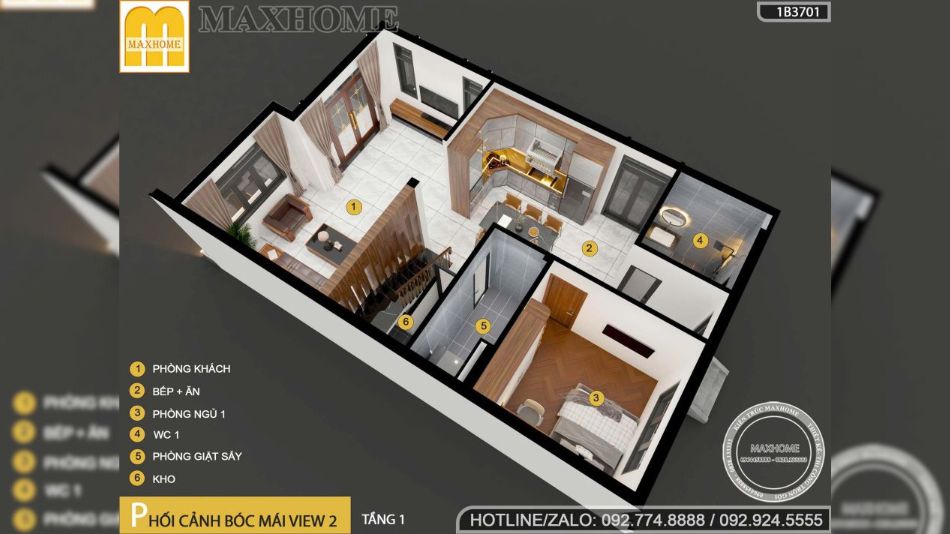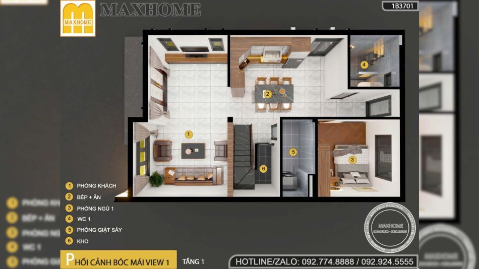 Từ cửa chính bước vào là không gian phòng khách rộng 20,5m², được bố trí hợp lý với bộ sofa lớn tạo cảm giác sang trọng và thoải mái khi đón tiếp khách. Khu vực bếp và phòng ăn được thiết kế liền kề, thuận tiện cho sinh hoạt hàng ngày và đảm bảo sự kết nối giữa các thành viên trong gia đình. Cuối nhà là một phòng ngủ yên tĩnh, thích hợp cho người lớn tuổi hoặc làm phòng nghỉ cho khách. Ngoài ra, khu vực chân cầu thang được tận dụng thông minh để làm phòng kho và khu giặt sấy, giúp tối ưu không gian và tăng tính tiện nghi cho ngôi nhà. Nhà vệ sinh chung được bố trí khoa học, dễ dàng tiếp cận từ mọi khu vực, đảm bảo sự tiện lợi và riêng tư trong quá trình sử dụng.