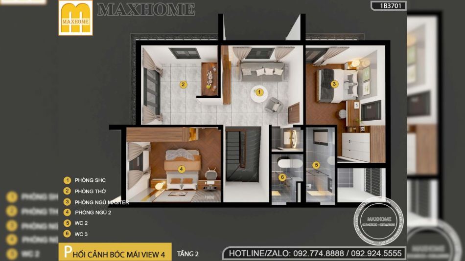 Tầng 2 được bố trí phòng thờ trang nghiêm, hướng đặt bàn thờ được tính toán hợp phong thủy, thể hiện lòng hiếu kính của gia chủ đối với tổ tiên. Liền kề phòng thờ là phòng sinh hoạt chung, nơi các thành viên quây quần, trò chuyện và thư giãn sau những giờ làm việc căng thẳng. Không gian tầng 2 còn bao gồm hai phòng ngủ, trong đó có một phòng ngủ thường dành cho con cái hoặc khách đến chơi, và một phòng ngủ master rộng rãi được tích hợp nhà vệ sinh khép kín cùng logia riêng, mang đến sự riêng tư, tiện nghi và thoáng mát cho người sử dụng. Tổng thể tầng 2 được thiết kế khoa học, đảm bảo sự cân đối giữa tính thẩm mỹ và công năng sử dụng.