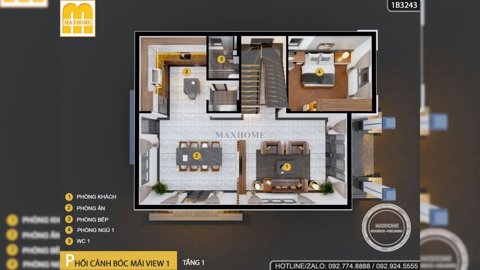 Về công năng bên trong, Maxhome bố trí 2 tầng rất hợp lý để phục vụ sinh hoạt của gia đình anh Quang. Tầng 1 được thiết kế theo tinh thần tiện dụng và kết nối, bước vào là không gian phòng khách rộng rãi 24m2 đón tiếp khách và cũng là khu sinh hoạt chung ấm cúng của cả nhà.