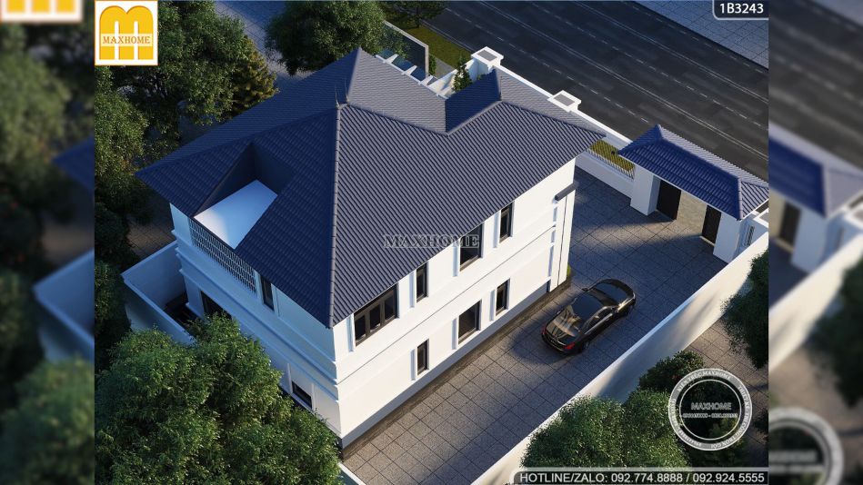 Hệ mái Nhật là yếu tố góp phần quan trọng tạo nên vẻ đẹp của mẫu nhà 2 tầng mái Nhật hiện đại này. Mái sảnh che hiên cũng được thiết kế đồng bộ với mái chính giúp tạo sự liên kết liền mạch và thống nhất. Kiểu mái Nhật với đặc trưng đổ rộng, thấp thoải giúp ngôi nhà cân đối và mềm mại hơn. Đồng thời hệ mái này còn mang đến khả năng chống nóng và thoát nước hiệu quả. Nhìn từ trên cao có thể thấy Maxhome đã tính toán tỉ mỉ từng góc mái để đảm bảo tổng thể luôn gọn gàng và đẹp mắt. Phía sau mái còn chừa khoảng trống để đặt bồn nước phục vụ sinh hoạt, một chi tiết nhỏ nhưng rất thiết thực đối với đời sống gia đình.