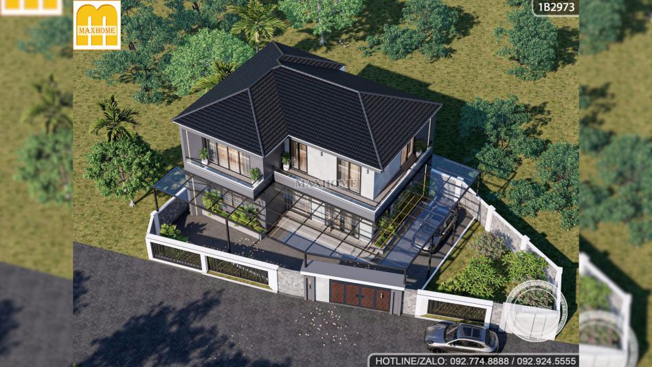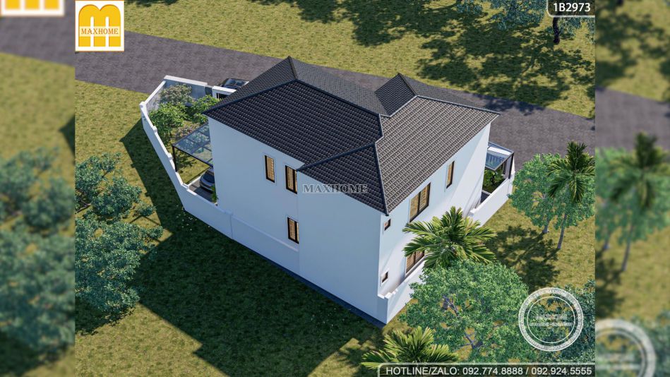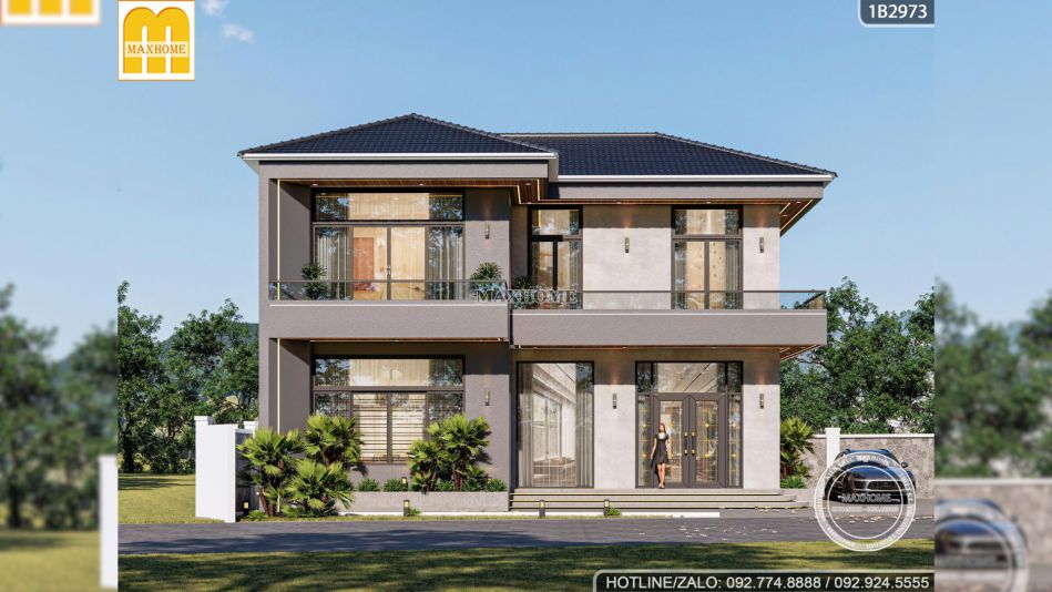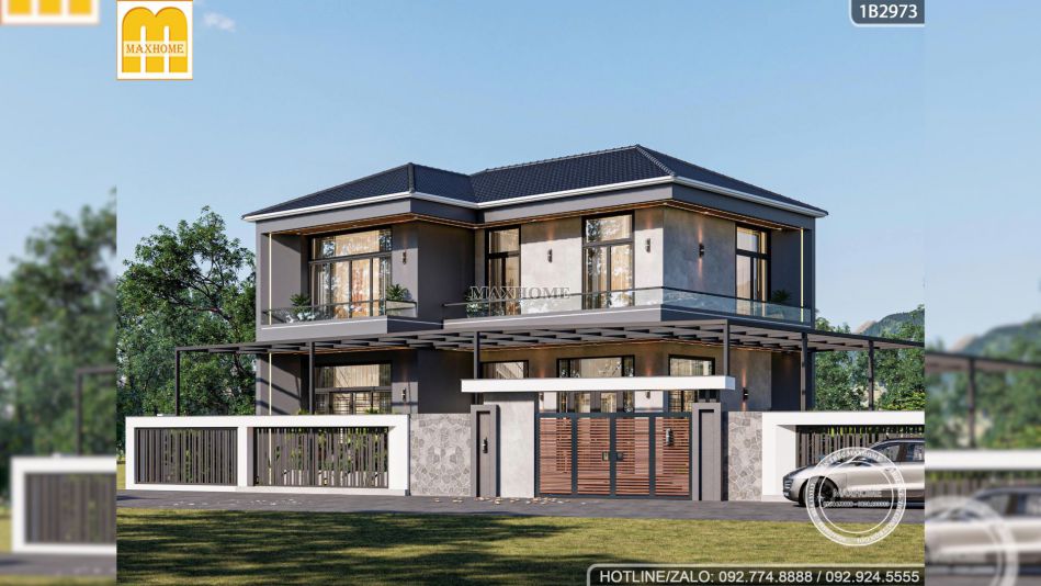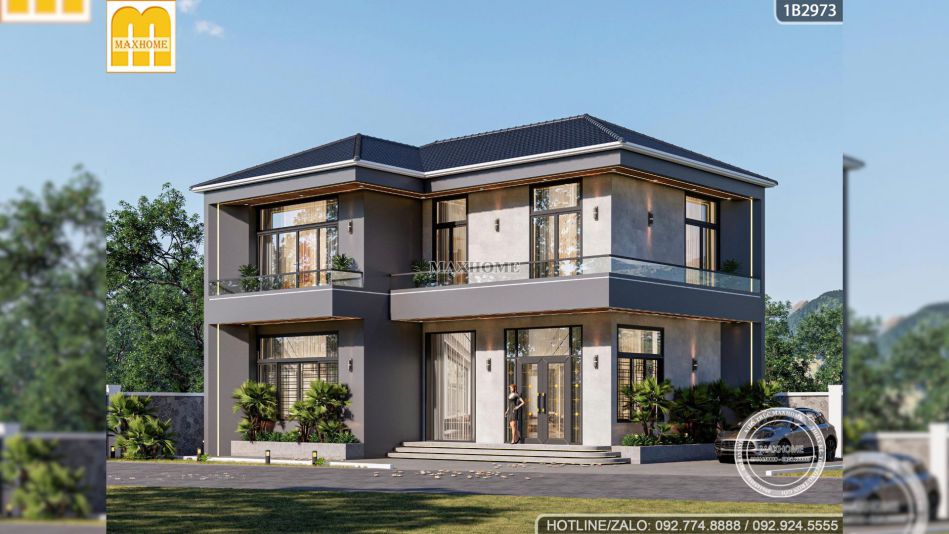 Trong thiết kế này, nhà 2 tầng mái Nhật được lựa chọn với hệ mái dốc nhẹ nhờ độ cao khiêm tốn 1,9m, các lớp mái ngói Maxhome cao cấp được xếp lớp tinh tế vừa đảm bảo khả năng thoát nước mưa tốt vừa mang lại sự cân đối cho tổng thể ngôi nhà. Tông màu mái xanh than trầm sang trọng tạo nên sự hài hòa cùng gam màu xám bê tông của tường giúp công trình toát lên thần thái vững chãi và bền bỉ. Đây cũng là điểm cộng lớn, bởi mái Nhật không chỉ bền đẹp theo thời gian mà còn phù hợp với điều kiện thời tiết khắc nghiệt ở miền Bắc.