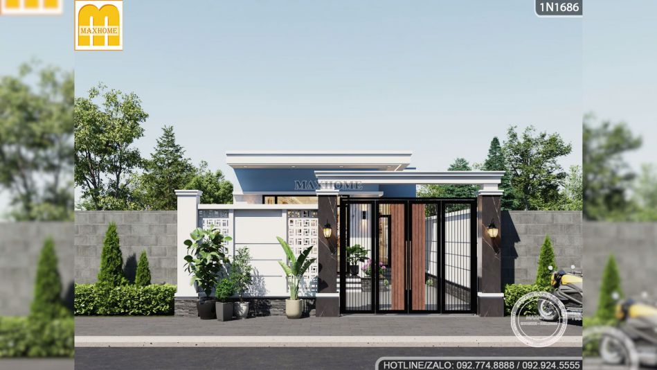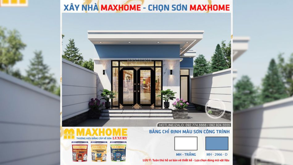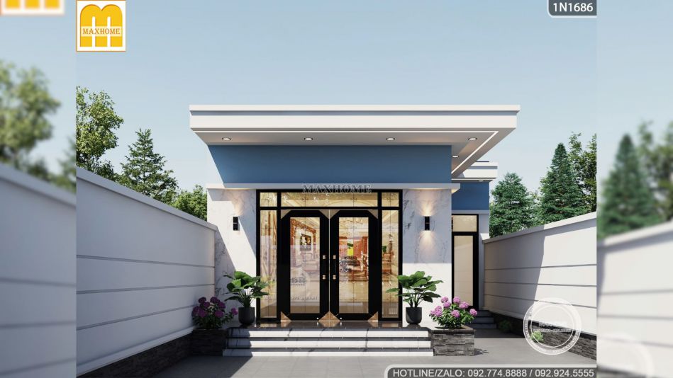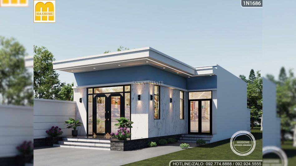 Một ưu điểm lớn khác của ngoại thất công trình là mặt tiền được ốp đá màu trắng vân mây xám nhẹ tạo hiệu ứng thị giác rất sang và sạch sẽ. Gam màu đá sáng giúp ngôi nhà như bừng lên giữa không gian xung quanh đồng thời mang lại cảm giác mát mẻ và hiện đại. Phía trên, đội ngũ thiết kế Maxhome cũng khéo léo sử dụng thêm màu xanh dương nhẹ cho mảng tường để tạo sự tương phản vừa đủ mà không gây rối mắt. Cách phối màu này khiến tổng thể nhà cấp 4 mái bằng trở nên hài hòa, trẻ trung nhưng vẫn giữ được vẻ tinh tế, đúng với tinh thần thiết kế hiện đại mà mẫu nhà đẹp này đang hướng tới.
