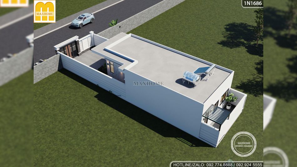 Kích thước khuôn đất nhà chú Ngọc là 7x25m, công trình được xây dựng gọn ở phía trong giúp tạo ra được khoảng sân nhỏ phía trước, tạo ra một khoảng đệm trước khi vào nhà rất tinh tế. Hướng nhà Tây Bắc được xây theo khuôn đất đã định sẵn trước đó vì đất ở TP Hồ Chí Minh rất đắt đỏ để có thể sở hữu được mảnh đất rộng.