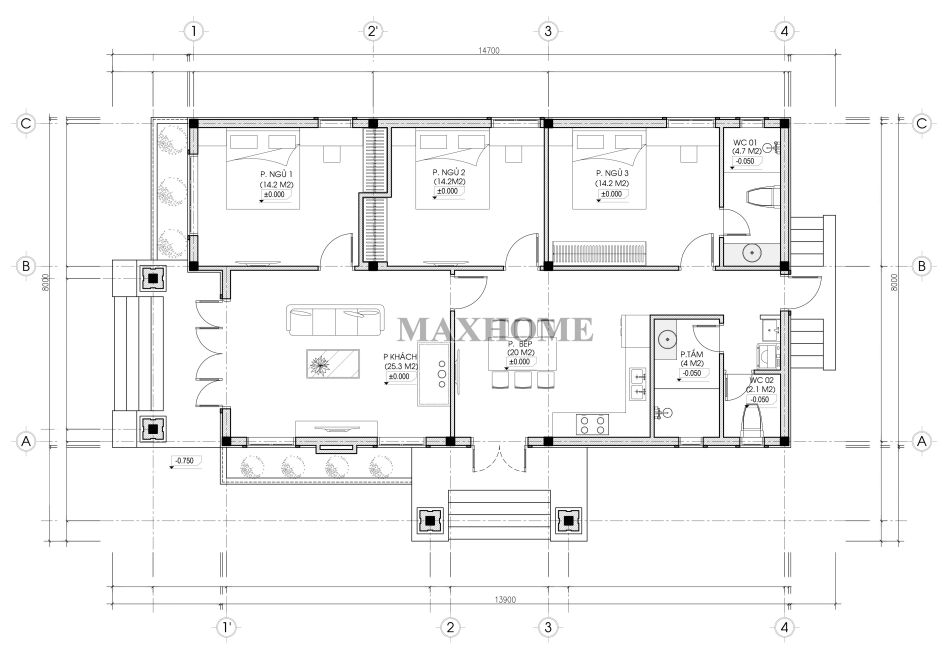 Từ sảnh phụ dẫn thẳng vào khu bếp ăn gọn gàng, tiện nghi với thiết kế mở giúp không khí lưu thông tốt, hạn chế mùi thức ăn lan sang các không gian khác. Ba phòng ngủ rộng rãi, đầy đủ tiện nghi, được bố trí cửa sổ lớn đón gió trời, ánh sáng tự nhiên. Cuối cùng là 1 phòng tắm và 1 nhà vệ sinh chung đặt ở phía cuối nhà hợp lý và tiện lợi cho sinh hoạt hàng ngày.