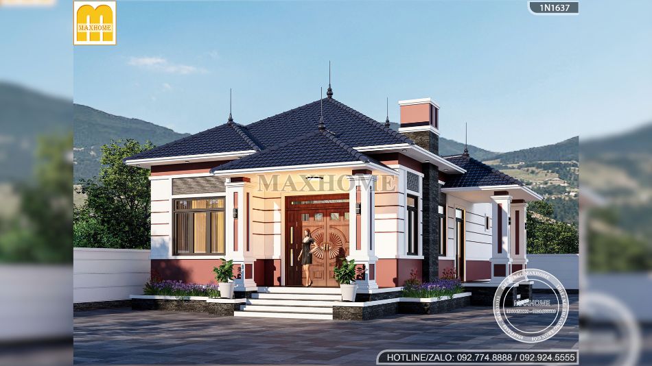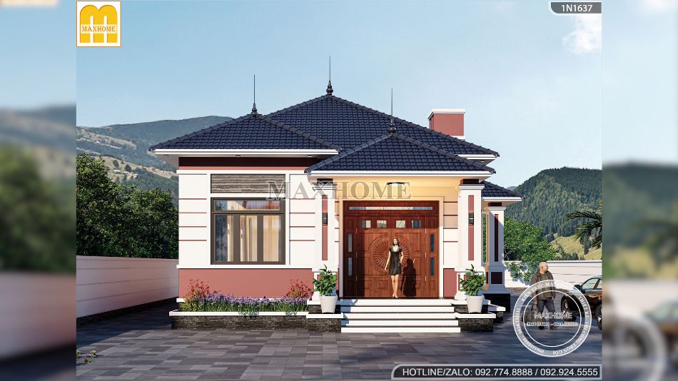 Điểm đầu tiên gây ấn tượng là hình khối mẫu nhà cấp 4 mái Nhật 110m2 được bố trí cân đối, gọn gàng nhưng có chiều sâu. Các mảng tường được phân chia theo tỷ lệ hợp lý, tạo cảm giác bề thế dù chỉ là nhà một tầng. Bậc tam cấp dẫn lối lên sảnh chính được ốp đá granite màu tối, tạo nên nét tương phản tinh tế với gam tường trắng – hồng đất chủ đạo. Chính sự đối lập nhẹ nhàng này làm nổi bật vẻ đẹp vững chãi mà mềm mại, hiện đại mà gần gũi.
