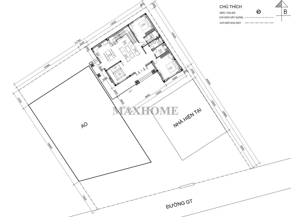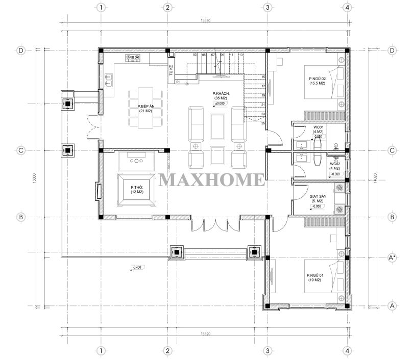 Công trình tọa lạc theo hướng Đông Bắc với kích thước 15,5 x 14m, tổng diện tích sử dụng 290m², mang đến không gian sống rộng rãi và tiện nghi. Các phòng chức năng được sắp xếp khoa học, hài hòa, tối ưu sự thoải mái cho mọi thành viên trong gia đình. Nhờ đó, ngôi nhà không chỉ đáp ứng đầy đủ công năng mà còn kiến tạo một môi trường sống lý tưởng, tiện lợi và hiện đại.