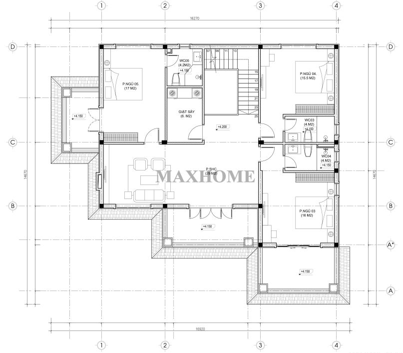 Ba phòng ngủ được sắp xếp khoa học, mỗi phòng đều có nhà vệ sinh riêng, đảm bảo sự riêng tư và tiện nghi tối đa. Ngoài ra, khu giặt sấy 6m² được bố trí gọn gàng, giúp quá trình sinh hoạt hàng ngày thêm thuận lợi, khẳng định sự tinh tế trong tư duy thiết kế của kiến trúc sư Maxhome.