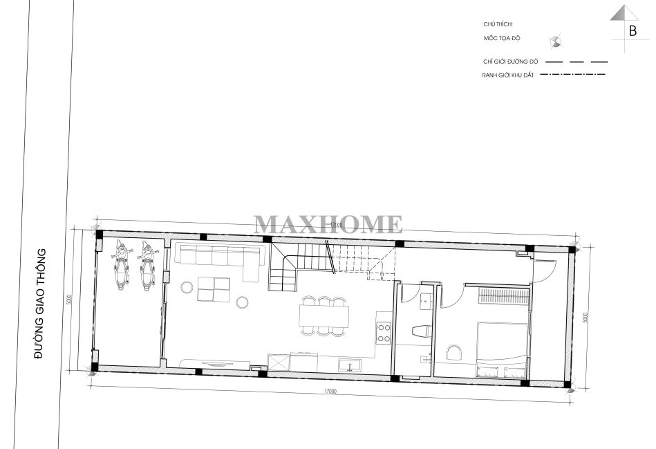 Về vị trí, công trình nằm ở hướng Tây Bắc, có kích thước 5 x 17m, tổng diện tích sử dụng rơi vào khoảng 175m². Mặt bằng công năng được bố trí khoa học, chú trọng tính tiện nghi và linh hoạt theo thói quen sinh hoạt thực tế, nhằm mang đến cho các thành viên trong gia đình một không gian sống tối ưu và thoải mái nhất.