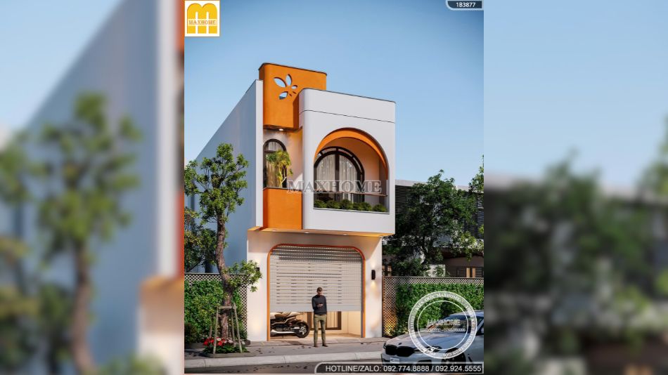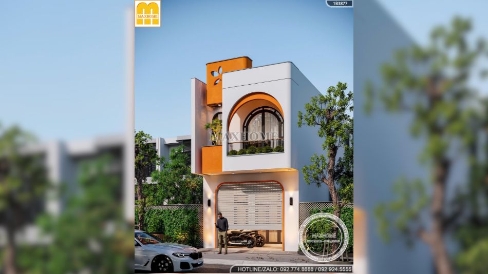 Gam màu chủ đạo của công trình là trắng kem kết hợp cam đất và đen nhấn. Màu trắng mang lại cảm giác sạch sẽ, hiện đại, giúp ngôi nhà luôn sáng và nổi bật trên phố. Màu cam đất được sử dụng có chủ đích, tập trung ở các mảng nhấn và chi tiết cong, tạo sự ấm áp và cá tính.
