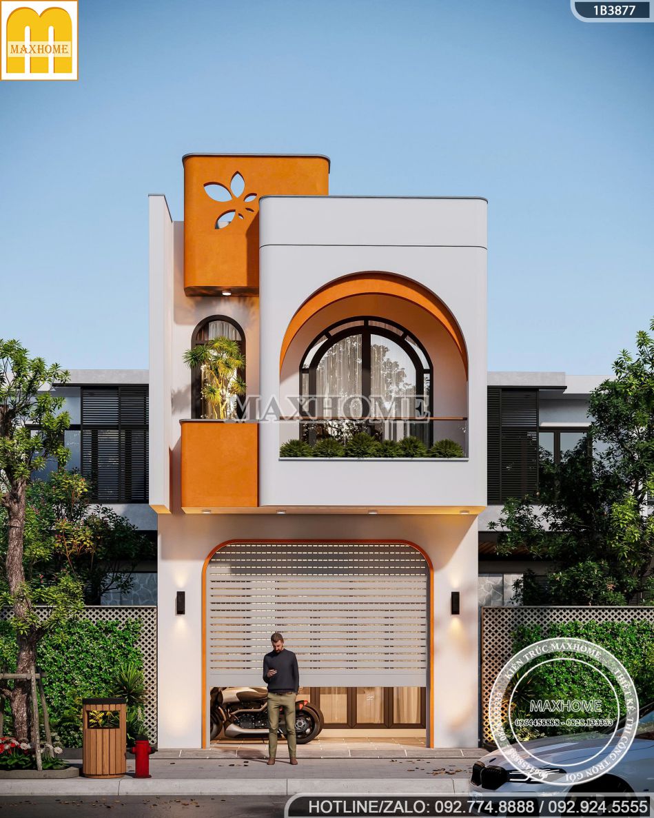 Bên cạnh đó, việc đưa các đường cong mềm mại hoặc giật cấp tinh tế vào thiết kế cũng là giải pháp hiệu quả để phá vỡ cảm giác cứng nhắc thường thấy ở nhà ống. Những chi tiết cong tại ban công, khung cửa hay mảng tường nhấn giúp tổng thể kiến trúc trở nên nhẹ nhàng, thanh thoát, đồng thời tạo hiệu ứng mở rộng không gian, mang lại cảm giác dễ chịu ngay từ cái nhìn đầu tiên.
