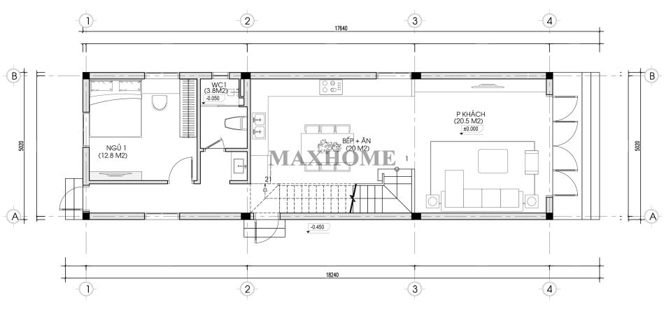 Bước từ cửa chính vào là không gian phòng khách được bố trí thông thoáng, liên thông trực tiếp với khu vực bếp và phòng ăn nhằm tạo cảm giác rộng rãi và thuận tiện trong sinh hoạt hằng ngày. Khu bếp được thiết kế hệ tủ chữ L khoa học, tối ưu diện tích sử dụng và tăng tính tiện nghi. Phía cuối ngôi nhà là phòng ngủ số 01, đảm bảo sự riêng tư và yên tĩnh; bên cạnh là khu vực vệ sinh chung được sắp xếp hợp lý, đáp ứng đầy đủ nhu cầu sinh hoạt của gia đình.