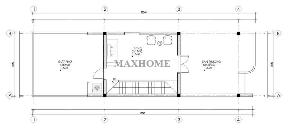 Tầng tum được bố trí hợp lý với phòng thờ thiết kế trang nghiêm, yên tĩnh, đảm bảo yếu tố phong thủy và sự tôn nghiêm trong không gian thờ cúng. Bên cạnh đó là khu vực sân thượng rộng rãi, phù hợp để thư giãn, trồng cây xanh hoặc làm không gian sinh hoạt ngoài trời. Khu vực giặt và sân phơi được sắp xếp khoa học, tách biệt, giúp quá trình sinh hoạt hằng ngày thuận tiện và giữ cho tổng thể ngôi nhà luôn gọn gàng, thông thoáng.