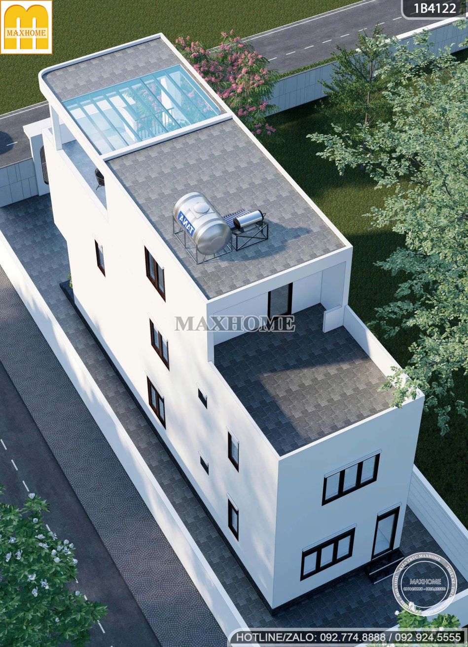 Hệ mái bằng của mẫu nhà phố 2 tầng 1 tum được thiết kế với độ dốc thoát nước nhẹ, bề mặt phía trên được ốp gạch hoàn thiện, giúp hạn chế thấm nước và tăng độ bền cho công trình. So với các loại mái như mái Nhật hay mái Thái, mái bằng mang lại cảm giác gọn gàng, thanh thoát, phù hợp với phong cách kiến trúc hiện đại. Đồng thời, giải pháp mái này còn giúp tối ưu chi phí xây dựng, rút ngắn thời gian thi công và thuận tiện cho việc bảo trì, cải tạo hoặc tận dụng làm sân thượng trong tương lai.