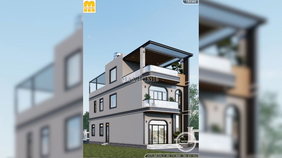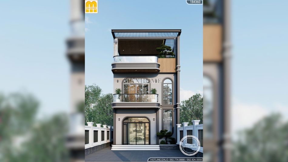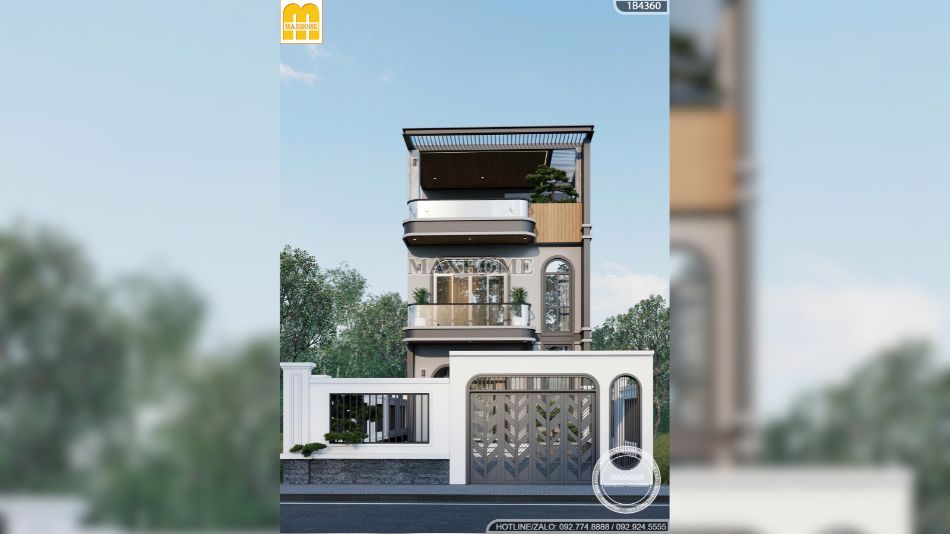Những đường cong mềm mại tại ban công được xử lý khéo léo, vừa làm dịu các mảng khối vuông vức vừa mang đến cảm giác thanh thoát, nâng tầm thẩm mỹ cho tổng thể công trình. Hệ cửa vòm bằng kính khổ lớn không chỉ là điểm nhấn kiến trúc cao cấp mà còn tối ưu khả năng lấy sáng, mở rộng tầm nhìn và tăng kết nối với không gian bên ngoài, giúp nhà phố luôn thông thoáng, tiện nghi và thể hiện rõ phong cách sống hiện đại, đẳng cấp của gia chủ.