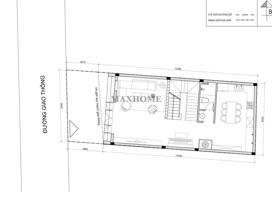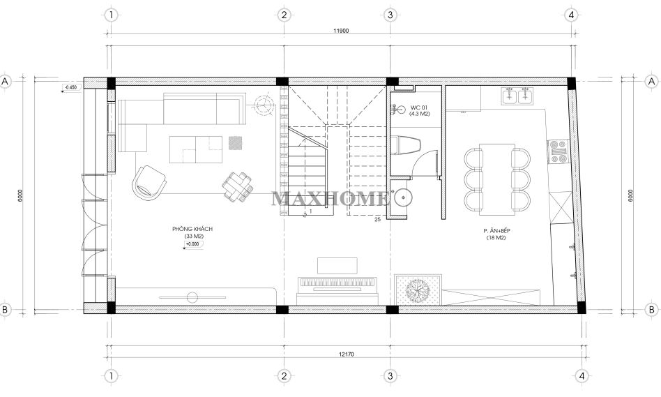 Từ cửa chính bước vào, ta sẽ bắt gặp phòng khách rộng rãi với diện tích lên đến 33m², được bố trí khoa học, thuận tiện cho việc tiếp khách và sinh hoạt gia đình. Tiếp nối không gian này là khu vực cầu thang được đặt ở vị trí trung tâm, giúp phân chia hợp lý giữa các khu chức năng. Phía sau là phòng bếp kết hợp phòng ăn, thiết kế thông thoáng, tiện nghi, tạo cảm giác ấm cúng cho mỗi bữa cơm gia đình. Bên cạnh đó, một nhà vệ sinh chung được bố trí gọn gàng ở khu vực gần bếp, thuận tiện cho sinh hoạt hằng ngày mà vẫn đảm bảo tính thẩm mỹ và sự riêng tư.