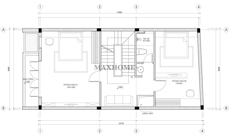 Tầng 2 được bố trí 2 phòng ngủ với diện tích hợp lý, đáp ứng đầy đủ nhu cầu nghỉ ngơi và sinh hoạt của các thành viên trong gia đình. Cả hai phòng đều sử dụng chung một nhà vệ sinh, được thiết kế tiện nghi, sạch sẽ và tối ưu diện tích sử dụng. Ngoài ra, kiến trúc sư còn khéo léo bố trí cửa sổ lớn và ban công hướng ra ngoài, giúp không gian tầng 2 luôn thông thoáng, đón được ánh sáng tự nhiên và gió trời, mang lại cảm giác dễ chịu và thư giãn tối đa.