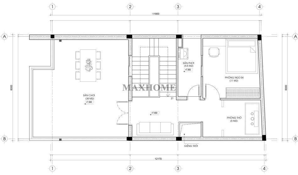Tầng 3 được thiết kế với không gian phòng thờ trang nghiêm, thể hiện lòng thành kính của gia chủ đối với tổ tiên. Bên cạnh đó là một phòng ngủ nhỏ, mang lại sự riêng tư và yên tĩnh, phù hợp cho khách hoặc thành viên trong gia đình nghỉ ngơi. Khu vực sân phơi được bố trí gọn gàng và tiện lợi, đáp ứng nhu cầu sinh hoạt hàng ngày. Đặc biệt, phía ngoài là sân chơi rộng rãi, nơi gia chủ có thể bố trí bàn trà, ghế thư giãn và trồng cây xanh xung quanh, tạo nên không gian mở lý tưởng để nghỉ ngơi, ngắm cảnh hoặc quây quần cùng gia đình vào mỗi buổi chiều.
