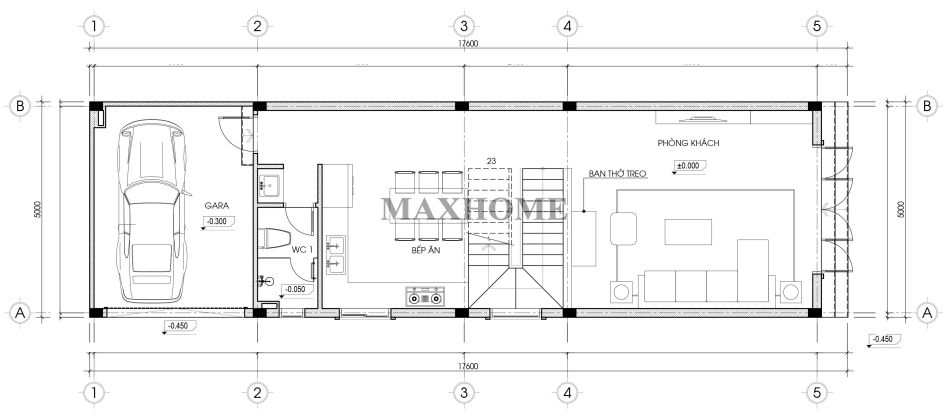 Từ cửa chính bước vào là không gian phòng khách được bố trí liền mạch, kết hợp bàn thờ treo gọn gàng, vừa đảm bảo yếu tố trang nghiêm vừa tiết kiệm diện tích, phù hợp với đặc thù nhà phố. Tiến sâu vào bên trong là khu vực bếp và phòng ăn, được sắp xếp cạnh lõi cầu thang giúp tối ưu diện tích và thuận tiện cho sinh hoạt hằng ngày. Ngay bên cạnh là nhà vệ sinh chung, bố trí kín đáo nhưng vẫn dễ tiếp cận. Cuối nhà là khu vực gara để xe, được thiết kế tách biệt, đảm bảo an toàn, thông thoáng và không ảnh hưởng đến không gian sinh hoạt chung của gia đình.