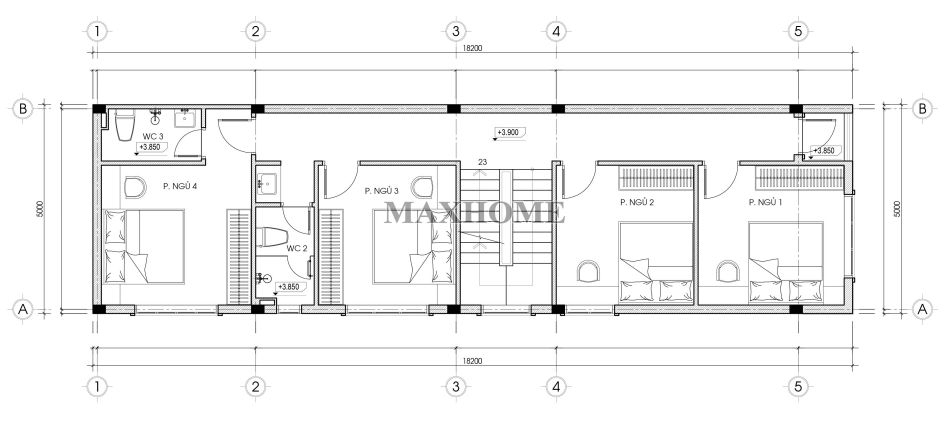 Tầng 2 được bố trí 4 phòng ngủ liền kề, đáp ứng tốt nhu cầu nghỉ ngơi cho các thành viên trong gia đình. Trong đó, phòng ngủ số 04 được ưu tiên thiết kế nhà vệ sinh khép kín, mang lại sự riêng tư và tiện nghi trong quá trình sử dụng. Ba phòng ngủ còn lại sử dụng nhà vệ sinh chung đặt ở cuối nhà, bố trí hợp lý, thuận tiện di chuyển mà vẫn đảm bảo sự tách biệt cần thiết. Cách sắp xếp công năng này giúp tối ưu diện tích, tạo sự thông thoáng và phù hợp với mô hình nhà phố hiện đại có nhiều phòng ngủ.