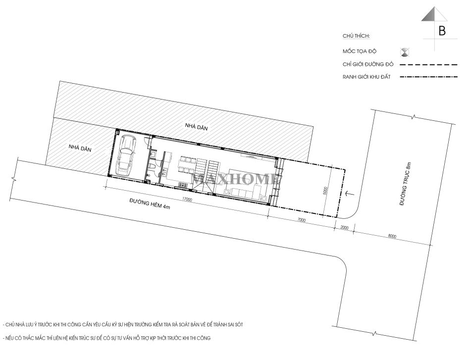 Thông qua mặt bằng định vị, có thể thấy mẫu nhà phố hiện đại sở hữu vị trí vô cùng đắc địa khi mặt tiền tiếp giáp trực tiếp với tuyến đường trục chính, thuận lợi cho việc di chuyển và giao thương. Bên hông công trình giáp mặt ngõ rộng 4m, tạo lợi thế lớn trong việc lấy sáng, thông gió và mở rộng tầm nhìn. Ngôi nhà được xây dựng trên khu đất có kích thước 5 x 17,6m, với cách tổ chức không gian hợp lý theo chiều cao, mang lại tổng diện tích sử dụng khoảng 217m².