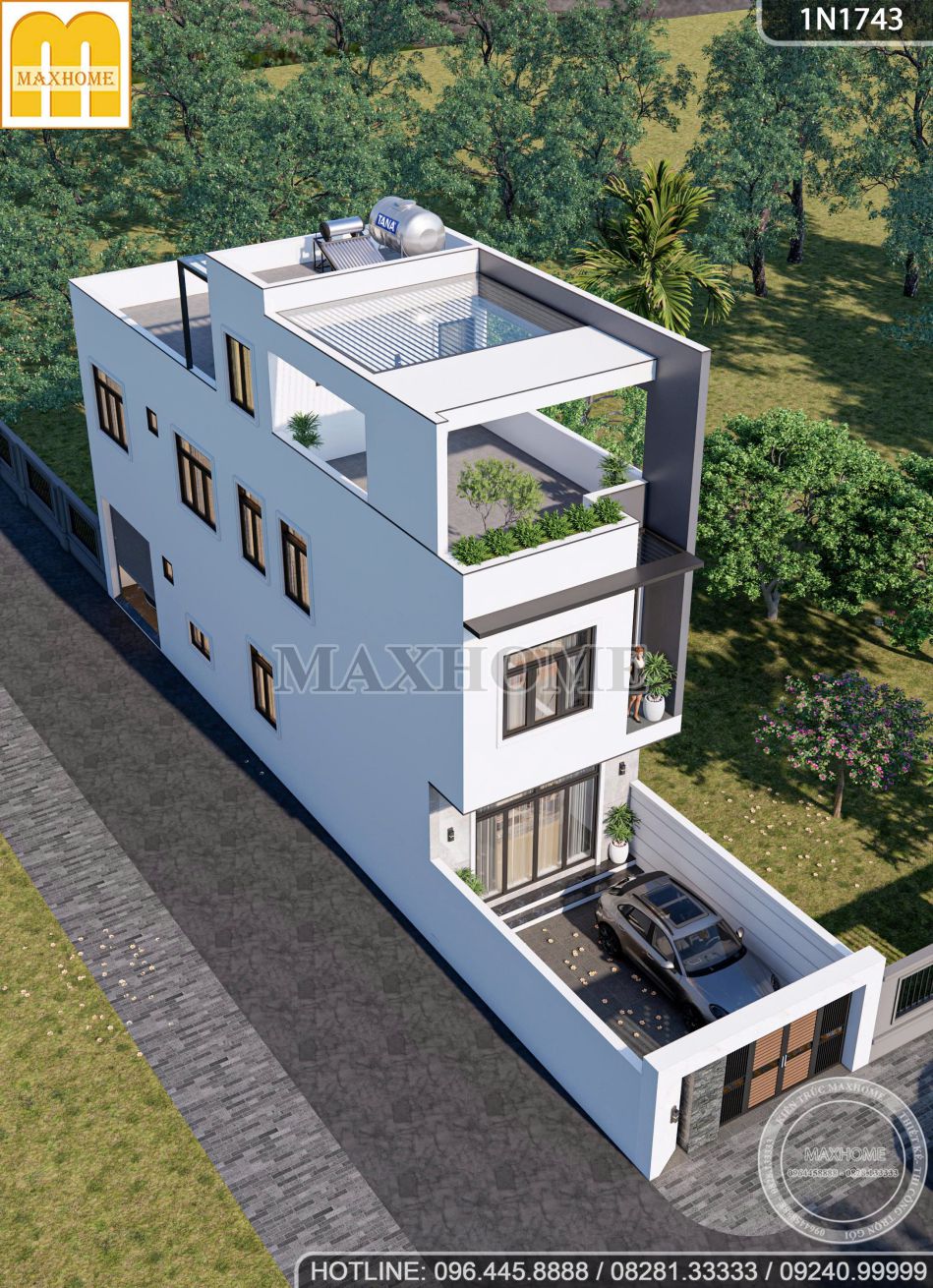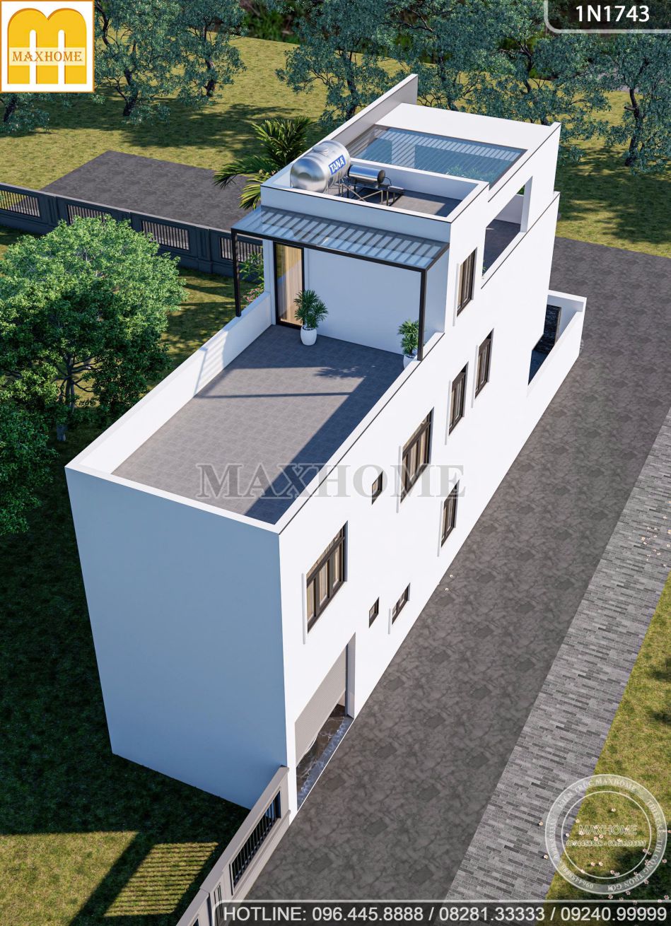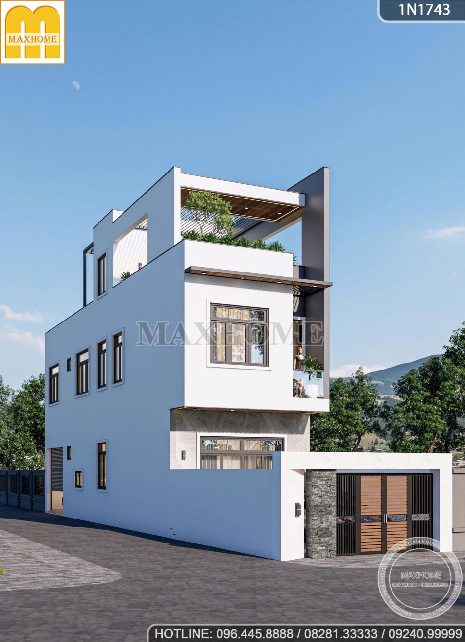 Trên khuôn viên đất có mặt tiền không quá rộng, đội ngũ kiến trúc sư Maxhome đã khéo léo đưa ra phương án thiết kế nhà phố hiện đại 3 tầng với bố cục khoa học và hình khối tinh gọn. Giải pháp tổ chức không gian theo chiều cao giúp tối ưu diện tích sử dụng, đồng thời đảm bảo đầy đủ công năng sinh hoạt cho gia đình. Mỗi khu vực chức năng được sắp xếp hợp lý, thông thoáng, tận dụng tối đa ánh sáng và gió tự nhiên, mang đến sự tiện nghi, thoải mái và phù hợp với nhịp sống đô thị hiện đại.