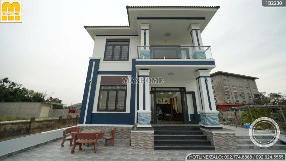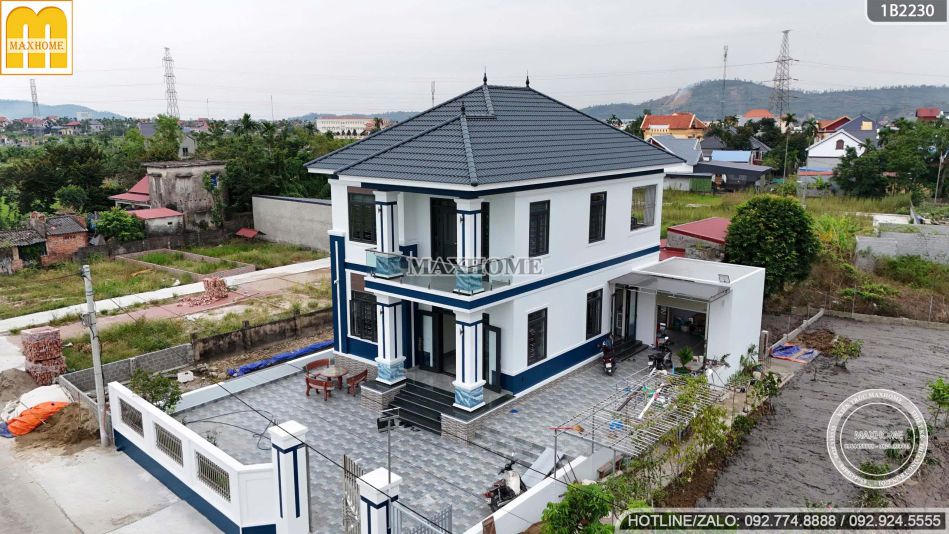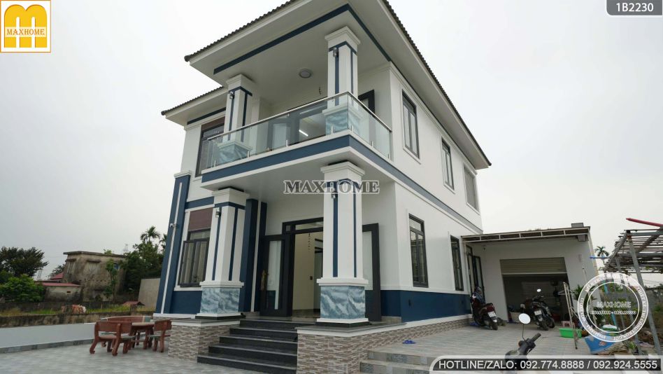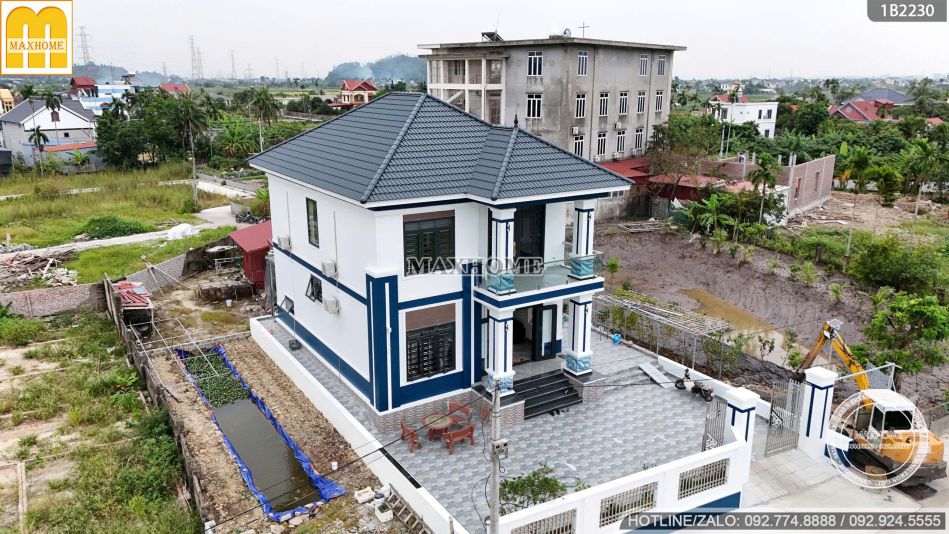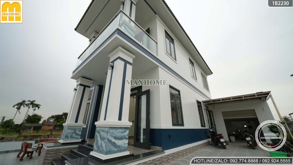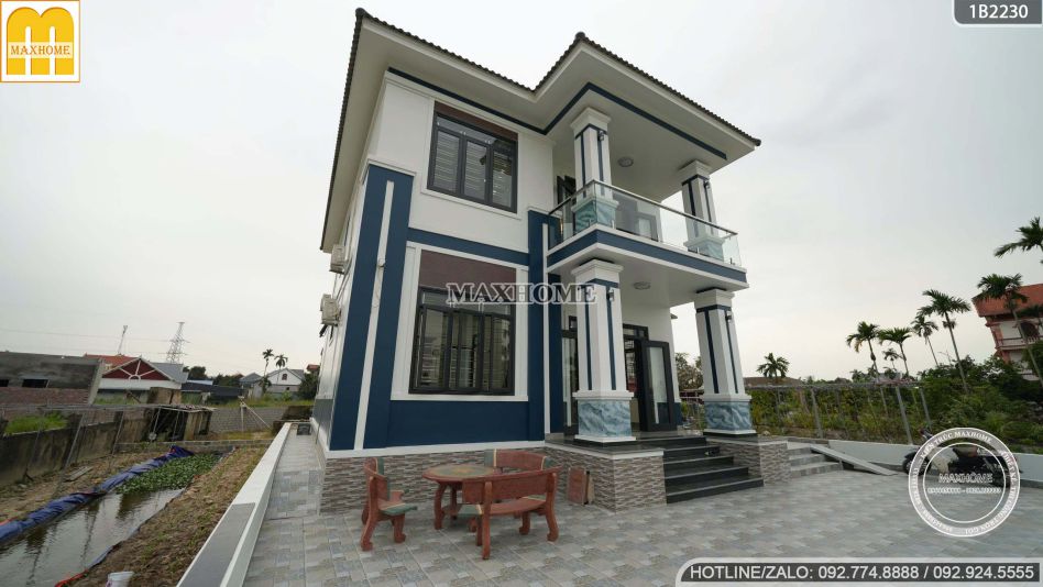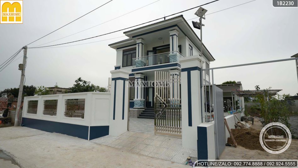 Mẫu nhà vườn 2 tầng mái Nhật được thiết kế với gam màu trắng làm chủ đạo, tạo nên vẻ ngoài tinh tế và thanh lịch. Điểm nhấn nổi bật nằm ở màu xanh lam được khéo léo phối hợp tại khu vực mặt tiền và các trụ cột, giúp tổng thể trở nên sinh động và hài hòa hơn. Sự kết hợp tinh tế giữa hai tông màu này không chỉ tôn lên vẻ hiện đại của công trình, mà còn mang đến cảm giác tươi mát, gần gũi với thiên nhiên, phù hợp với phong cách kiến trúc nhà vườn nghỉ dưỡng đang được ưa chuộng hiện nay.