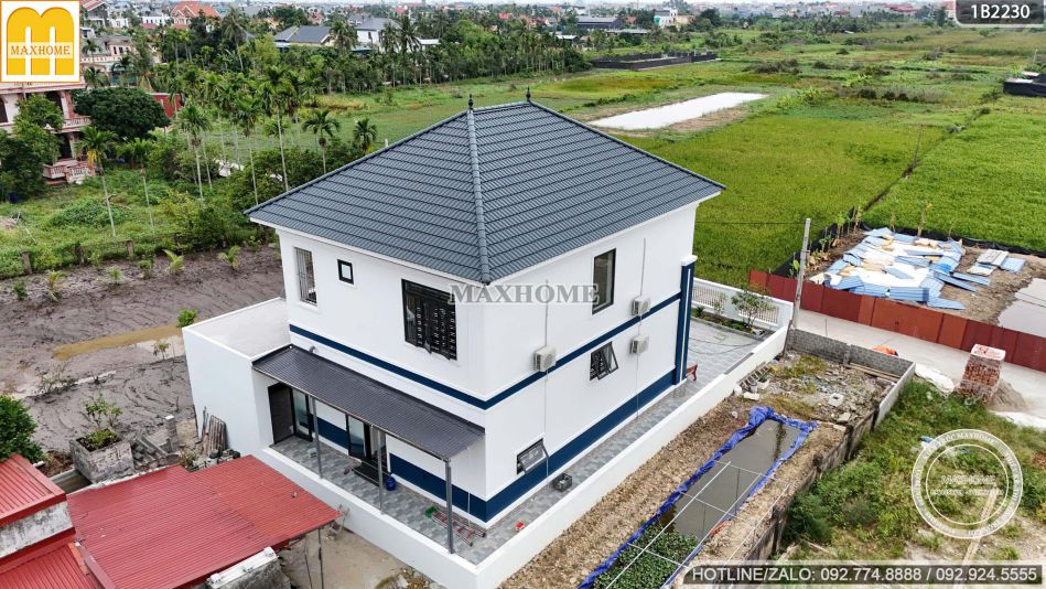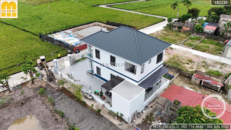 Từ xa nhìn xuống, mẫu nhà vườn 2 tầng mái Nhật hiện lên nổi bật giữa khung cảnh yên bình của An Dương, Hải Phòng. Với khuôn viên đất rộng khoảng 300m², công trình được quy hoạch khoa học và cân đối, vừa đảm bảo diện tích xây dựng hợp lý cho ngôi nhà chính, vừa có đủ không gian để bố trí sân vườn xanh mát, tiểu cảnh và khu sinh hoạt ngoài trời. Tổng thể kiến trúc toát lên vẻ hiện đại pha chút truyền thống, mang đến một không gian sống tiện nghi, gần gũi thiên nhiên và đầy tính thẩm mỹ.