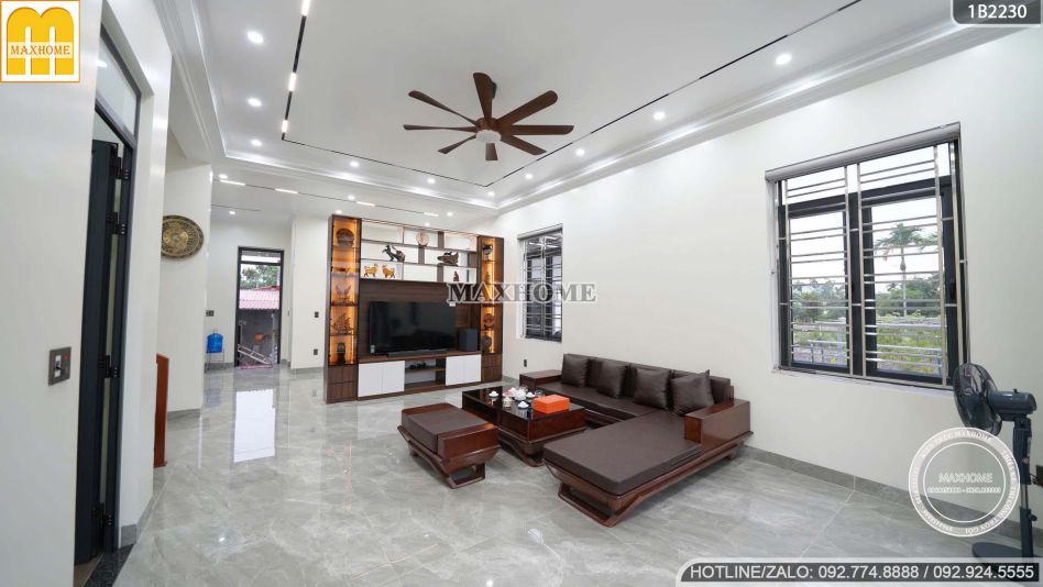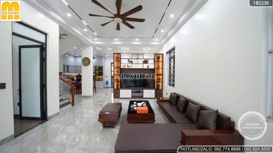 Phòng khách được thiết kế rộng rãi và thông thoáng, nổi bật với bộ sofa gỗ cao cấp kết hợp đệm ngồi êm ái, mang đến sự thoải mái và sang trọng cho không gian tiếp khách. Bên cạnh đó, hệ lam trang trí kết hợp kệ tivi được bố trí tinh tế, vừa có tác dụng phân chia không gian nhẹ nhàng, vừa tạo điểm nhấn thẩm mỹ cho căn phòng. Tất cả các chi tiết nội thất đều được phối hợp hài hòa về màu sắc và chất liệu, giúp tổng thể phòng khách trở nên ấm cúng, hiện đại và đầy tính thẩm mỹ.