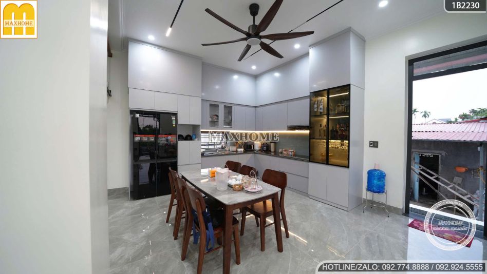 Phòng bếp ăn được thiết kế rộng rãi, thoáng mát và đầy tinh tế, nổi bật với hệ tủ bếp chữ L làm từ gỗ MDF chống ẩm phủ acrylic bóng gương, mang đến vẻ đẹp hiện đại và sang trọng. Cách bố trí tủ bếp thông minh giúp tối ưu hóa không gian lưu trữ, tạo sự tiện nghi trong quá trình sử dụng. Đặc biệt, khu vực tủ rượu liền kề được thiết kế tinh xảo, vừa có tác dụng trang trí, vừa thể hiện gu thẩm mỹ và phong cách sống đẳng cấp của gia chủ. Tổng thể không gian bếp – ăn mang đến cảm giác ấm cúng, tiện nghi, là nơi lý tưởng để cả gia đình quây quần và thưởng thức những bữa ăn ngon miệng.