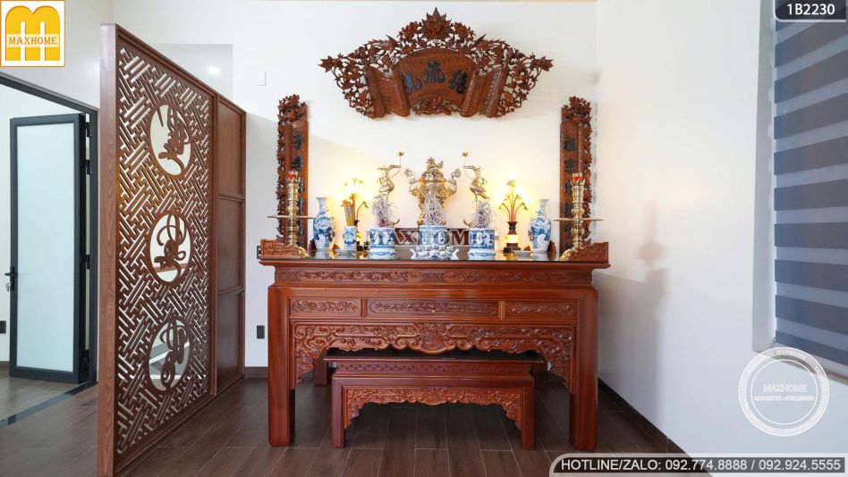 Phòng thờ được bố trí tại tầng 2 của ngôi nhà, sử dụng toàn bộ chất liệu gỗ tự nhiên mang lại cảm giác ấm cúng và trang nghiêm, đúng với nét văn hóa tâm linh truyền thống của người Việt. Không gian được thiết kế theo hướng phong thủy phù hợp, đảm bảo sự thanh tịnh và trang trọng, giúp gia chủ dễ dàng bày tỏ lòng thành kính với tổ tiên. Bên cạnh đó, ánh sáng và màu sắc nội thất được lựa chọn khéo léo, tạo nên sự hài hòa, tôn nghiêm nhưng vẫn gần gũi, góp phần hoàn thiện nét đẹp tinh tế của toàn bộ không gian thờ tự.