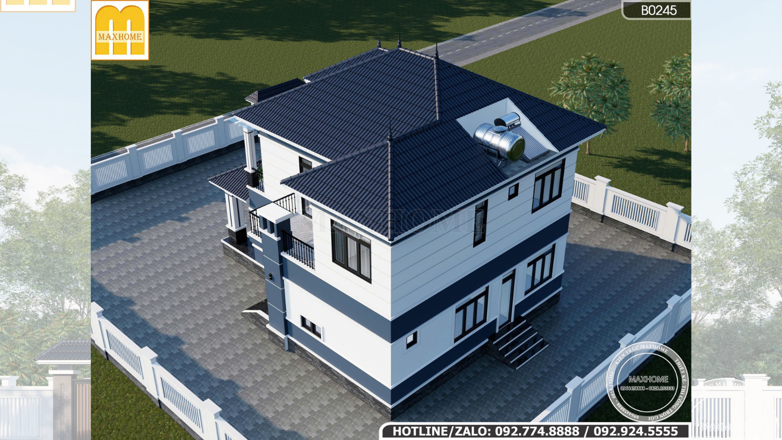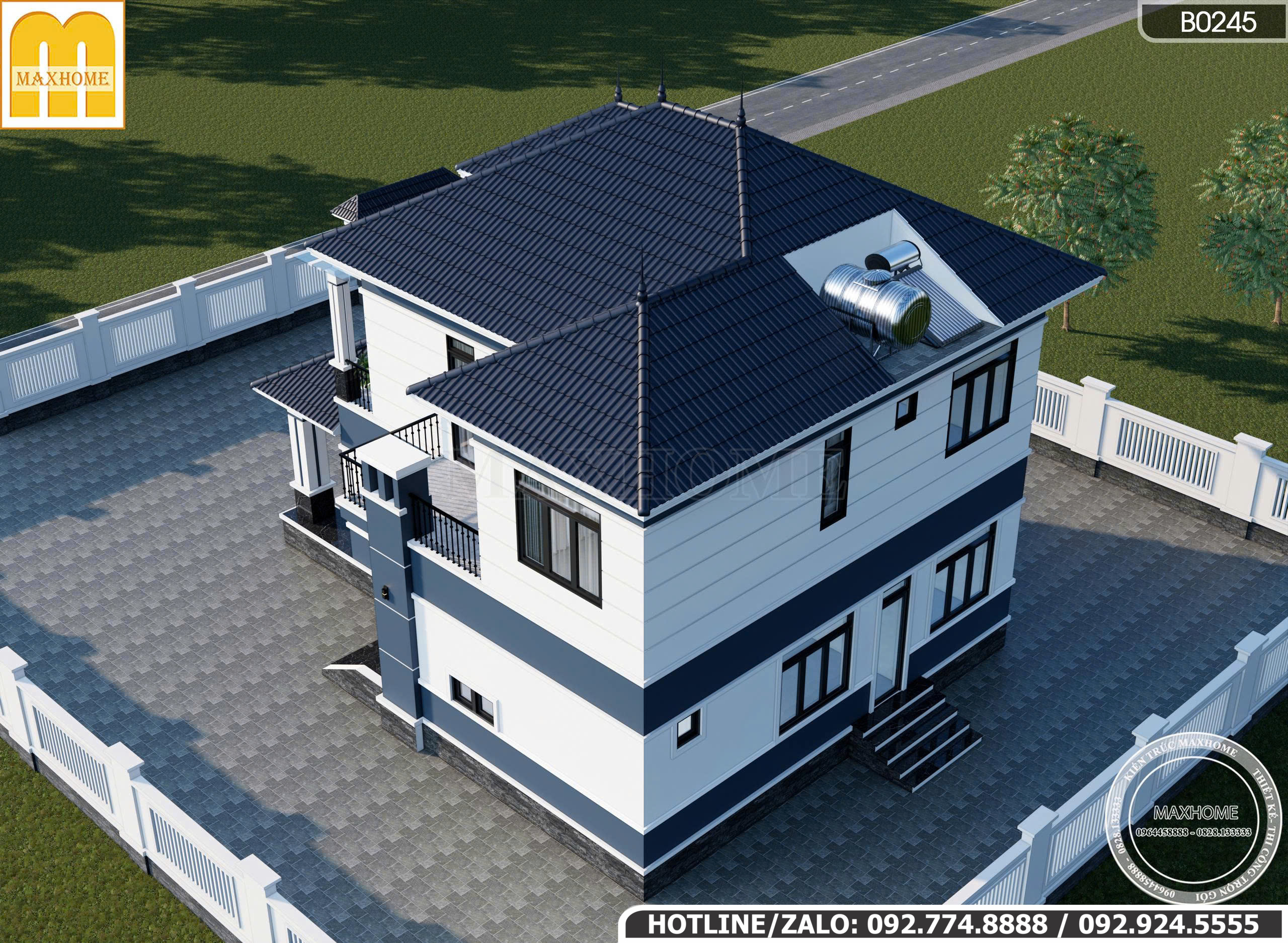 Ngôi nhà được sử dụng hệ mái Nhật lợp ngói màu xanh than cùng tone màu với màu sơn của tường. Mái có độ đua vừa phải, từ khối nhà chính cho đến các phần sảnh hiên tầng 1. Với độ dốc vừa phải, mái Nhật có khả năng thoát nước mưa nhanh chóng, hạn chế tình trạng ứ đọng gây thấm dột. Bên cạnh đó, cấu tạo mái nhiều lớp còn góp phần chống nóng hiệu quả, giảm tác động trực tiếp của thời tiết, từ đó nâng cao độ bền và tuổi thọ cho công trình. Các kim thu sét trên đỉnh mái được bố trí mang tính thẩm mỹ, an toàn.