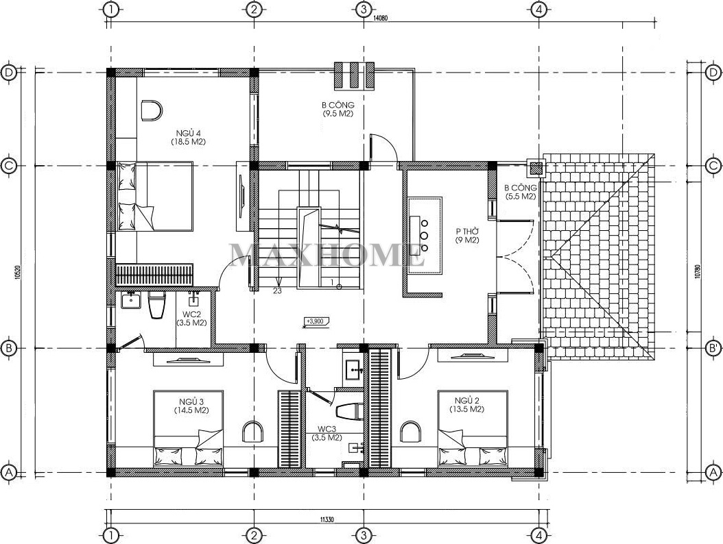 Từ mặt bằng công năng tầng 1, không gian mặt bằng tầng 2 được kết nối mạch lạc và khoa học. Khu vực phòng thờ được bố trí trang trọng, hướng thẳng ra mặt tiền chính của căn nhà, được kết hợp với một ban công riêng. Thiết kế này giúp khu vực thờ cúng luôn đón được vượng khí, ánh sáng tự nhiên và thoát mùi nhang khói rất tốt, giữ cho không gian luôn thanh tịnh.
