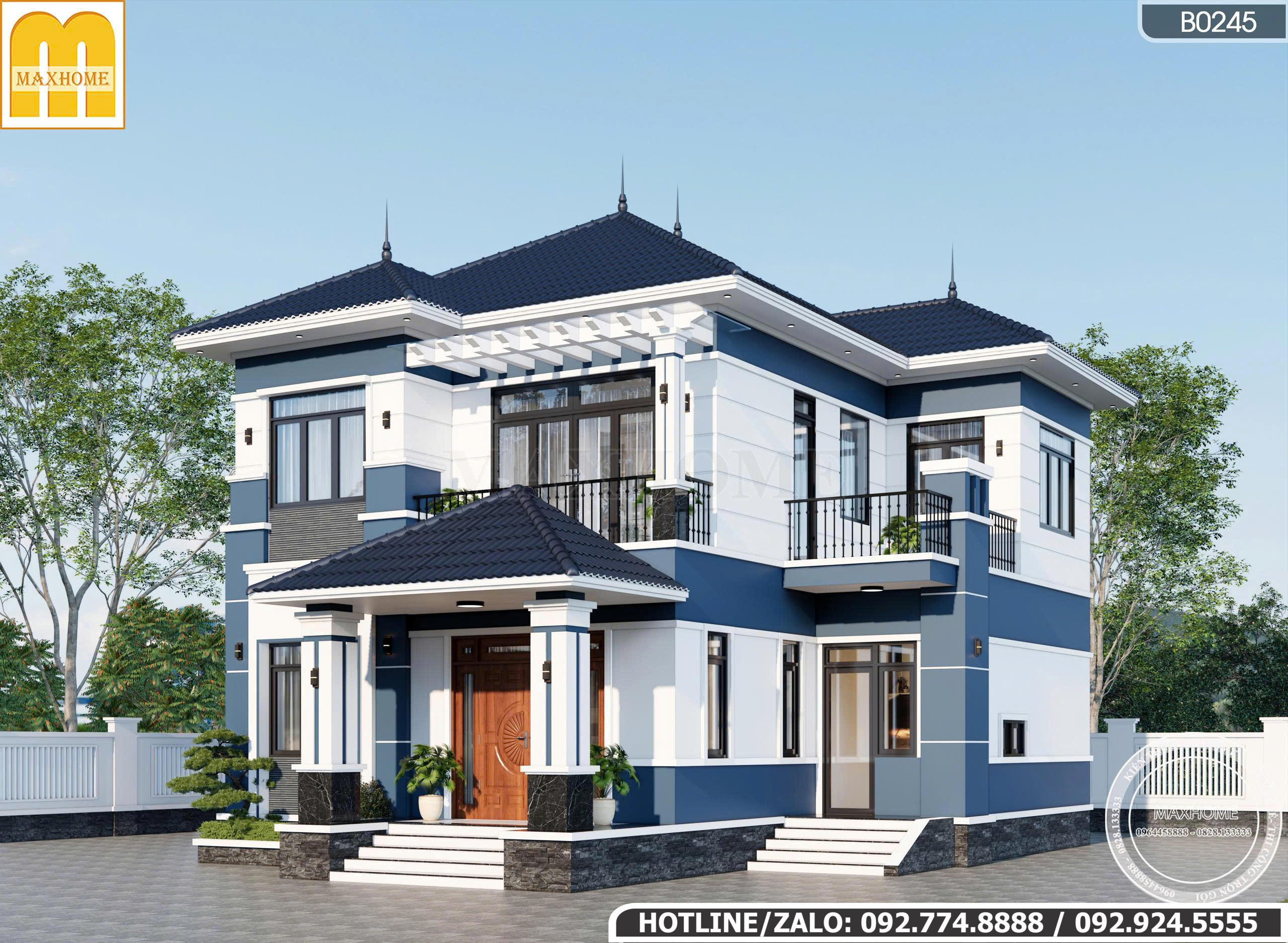 Mặt tiền được chia làm hai khối, tạo chiều sâu cho ngôi nhà. Ở phía sảnh chính đua ra phía trước với hệ mái hiên lớn che chắn, giúp căn nhà trông bề thế hơn. Trụ cột vuông ở phía sảnh chính kích thước lớn, mang lại cảm giác vững chãi. Phần thân cột được thiết kế đơn giản, trong khi phần chân và đầu cột được đắp nổi vuông vức. Phần chân cột sảnh và chân tường được ốp đá tự nhiên tối màu. Điều này không chỉ tăng tính thẩm mỹ, tạo nên sự vững chãi mà còn bảo vệ chân công trình khỏi rêu mốc, bụi bẩn.