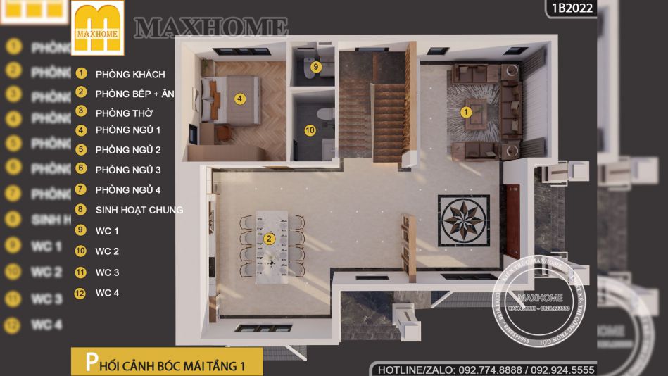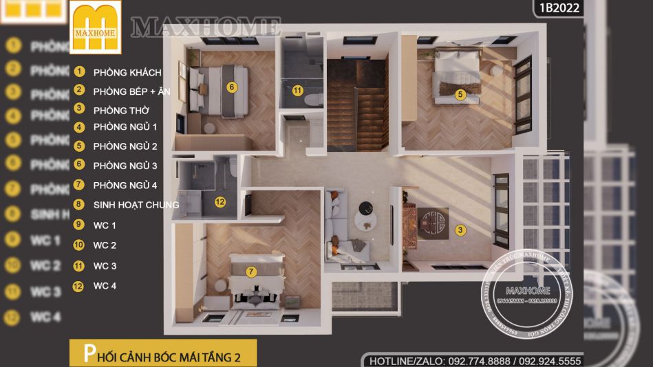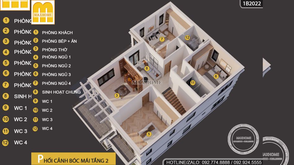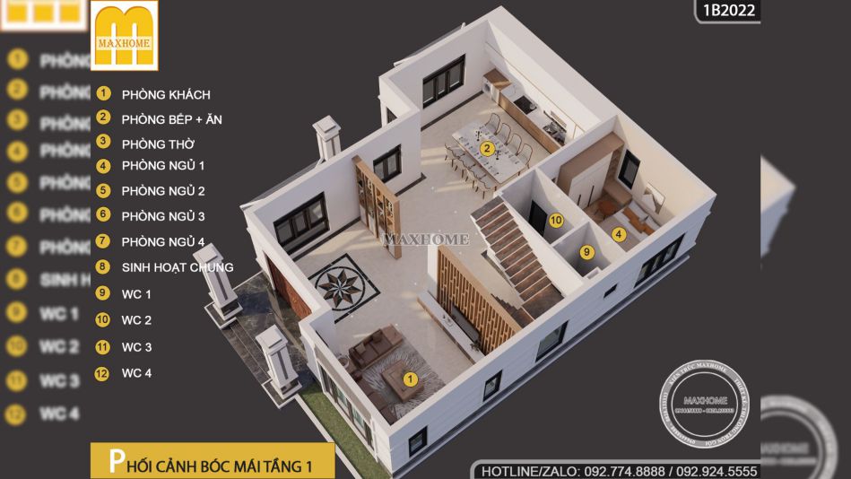 Không chỉ dừng lại ở phần kiến trúc bên ngoài, Maxhome còn tối ưu hóa từng chi tiết để mang đến sự tiện nghi và khoa học cho gia đình chị Hà. Với diện tích 230m2, nhà 2 tầng 4 phòng ngủ này đảm bảo không gian sinh hoạt riêng tư cho từng thành viên đồng thời vẫn có những khu vực sinh hoạt chung rộng rãi để gắn kết gia đình.